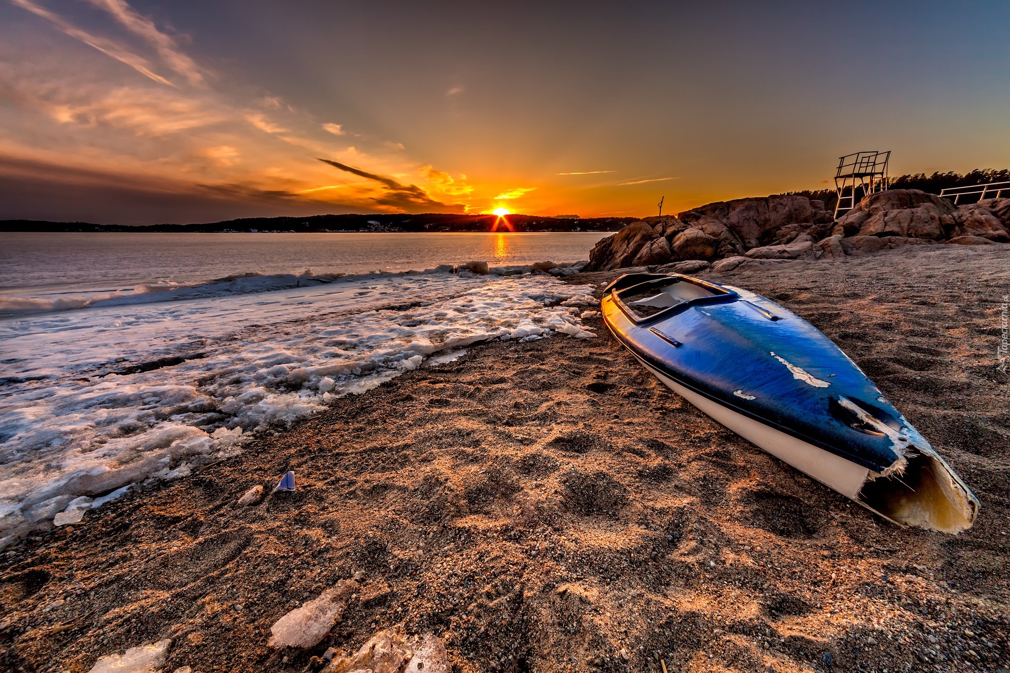 Edytor tapety: Morze, Plaża, Zachód, Słońca, Połamany, Kajak