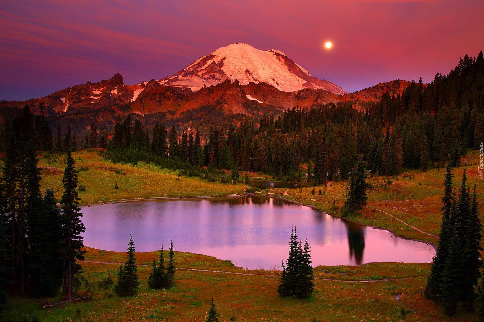Edytor tapety: Góry, Lasy, Jeziorko, Zachód Słońca
