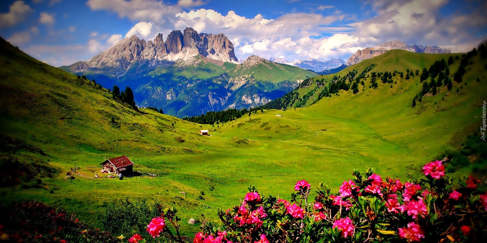 Edytor tapety: Góry, Łąki, Obłoki, Zagroda, Kwitnące, Rododendrony