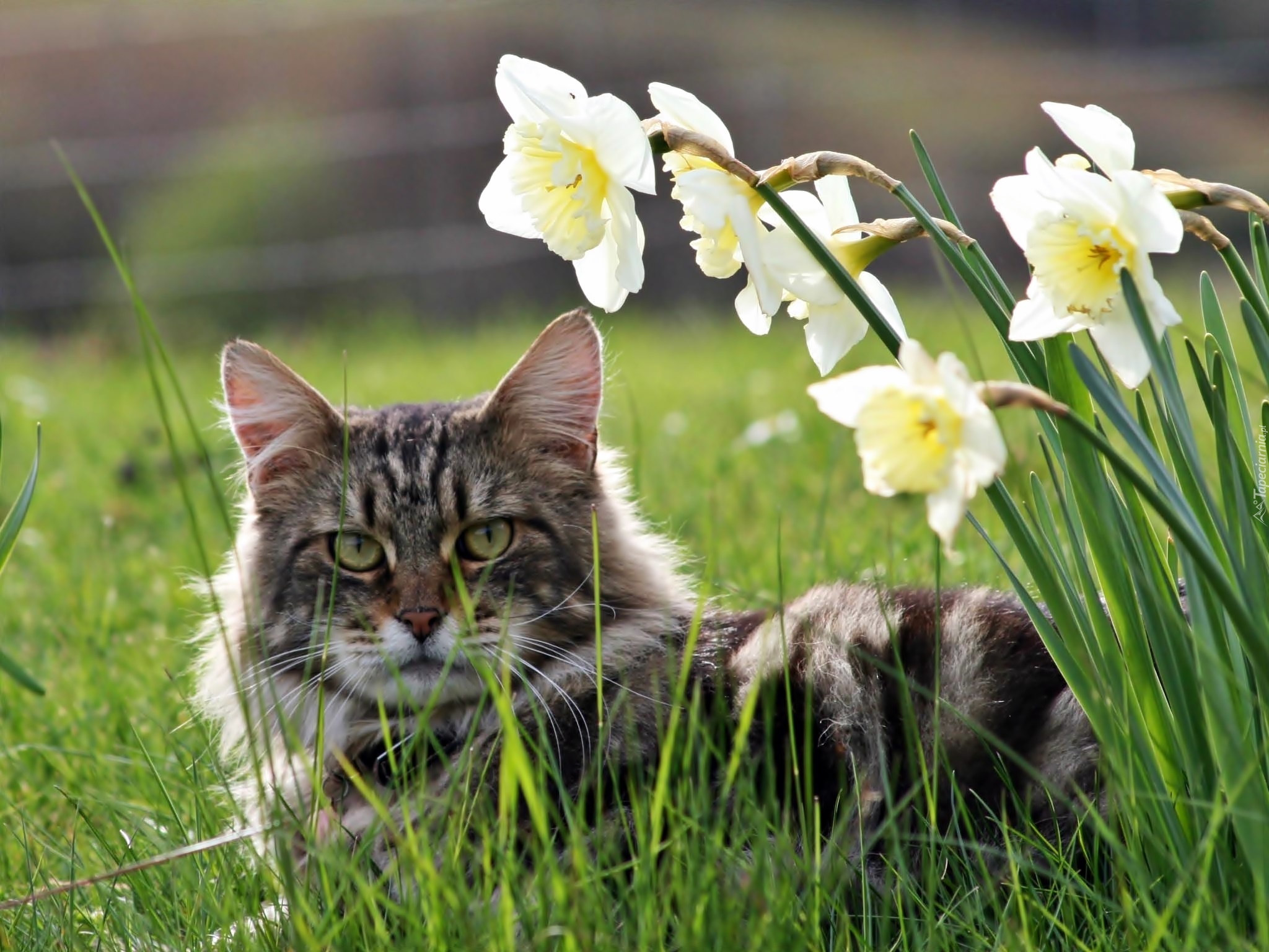 Edytor tapety: Kot, Maine, Coon, Trawa, Narcyzy