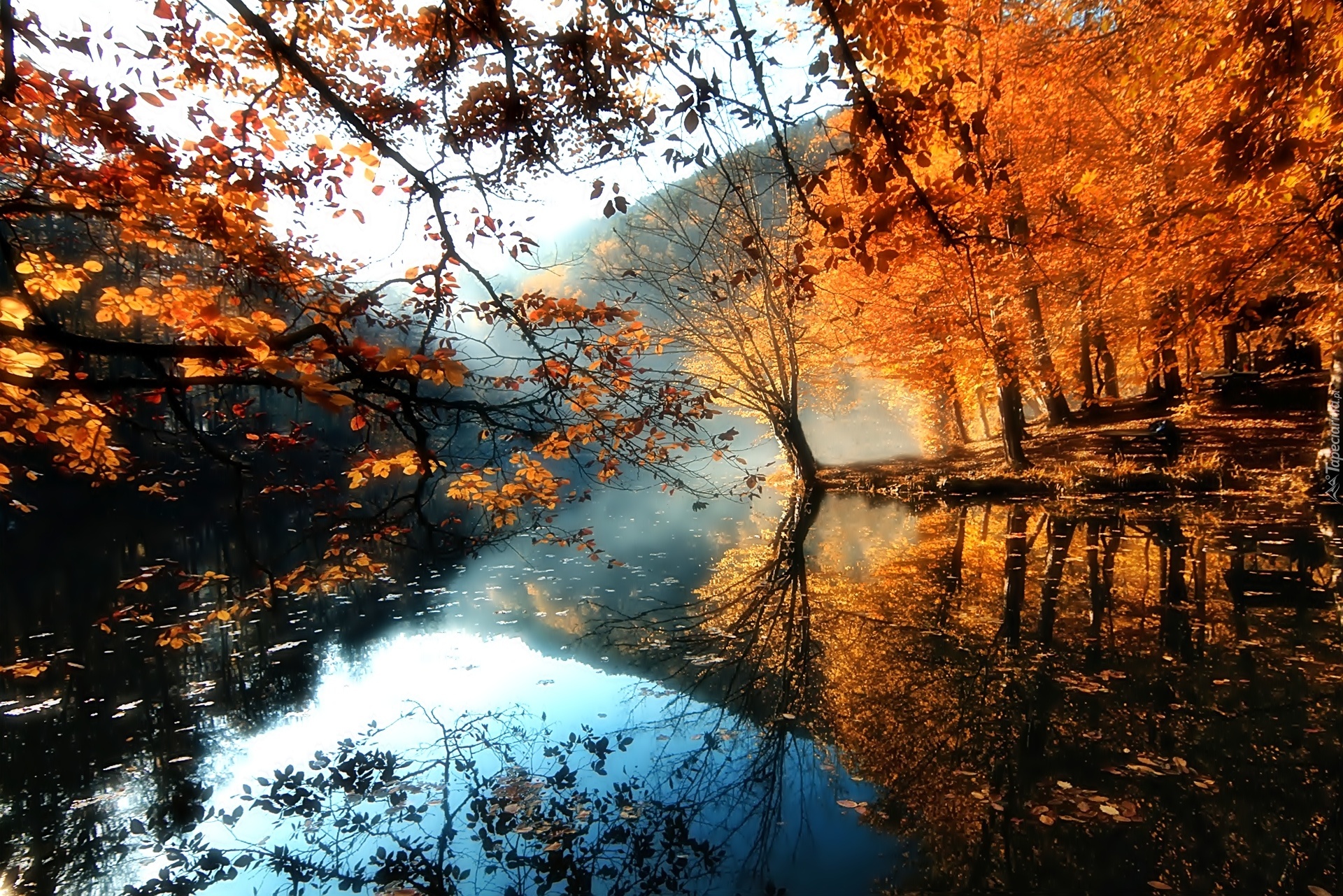 Edytor tapety: Jesień, Mgła, Rzeka, Drzewa