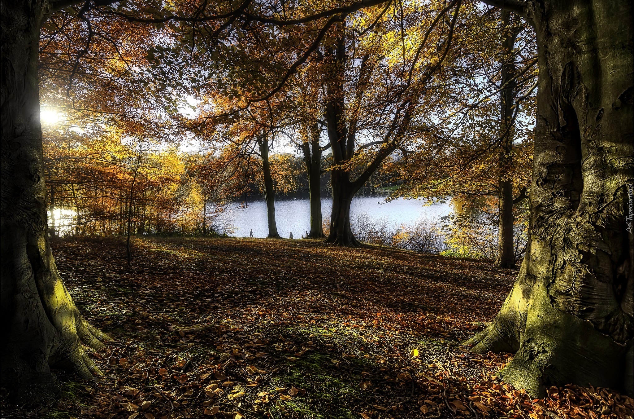 Edytor tapety: Jesień, Drzewa, Przebijające światło, Woda, Park
