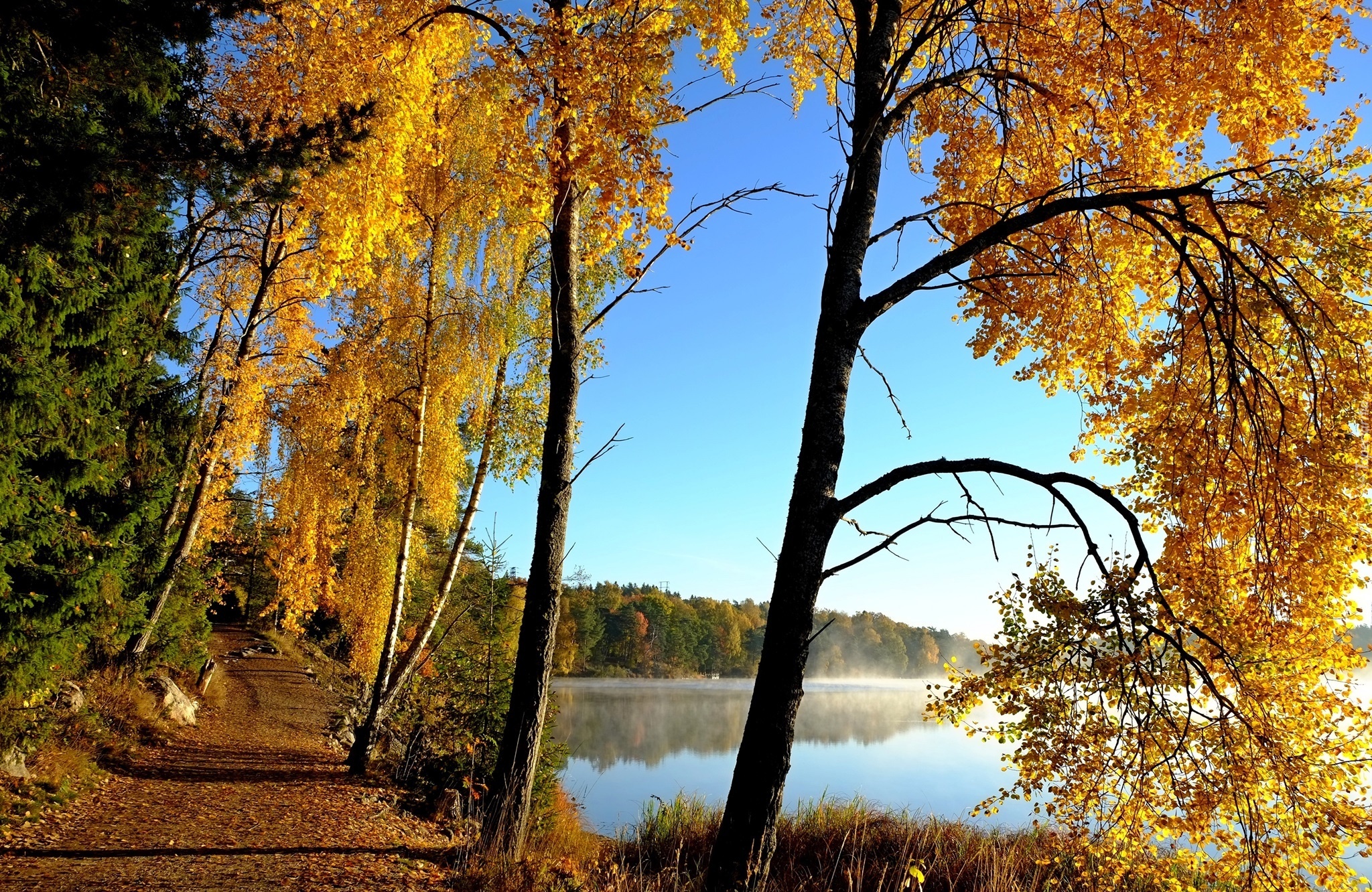 Edytor tapety: Jesień, Jezioro, Poranek, Mgła, Drzewa