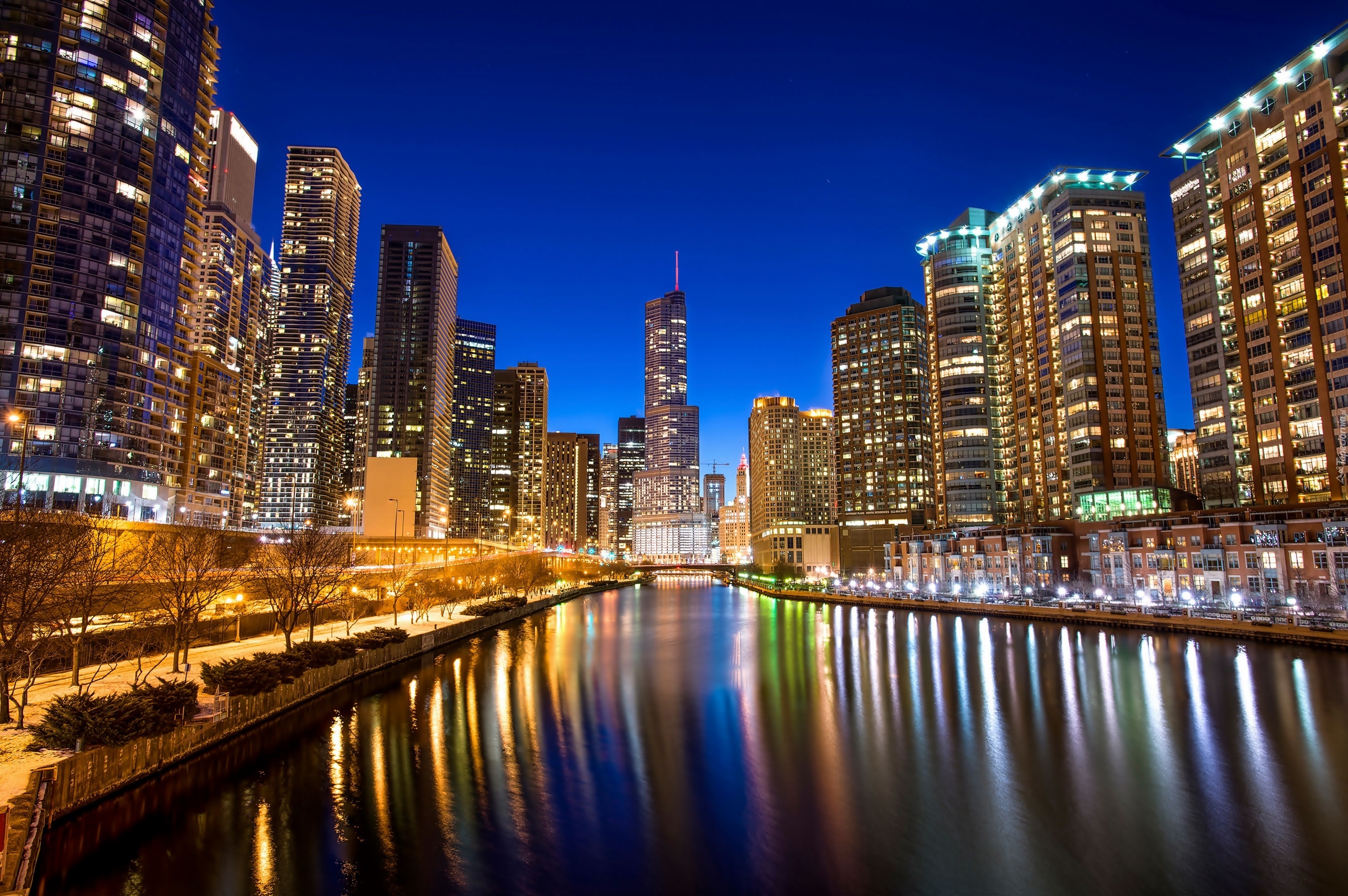 Edytor tapety: Drapacze chmur, Rzeka, Chicago, Miasto, Noc