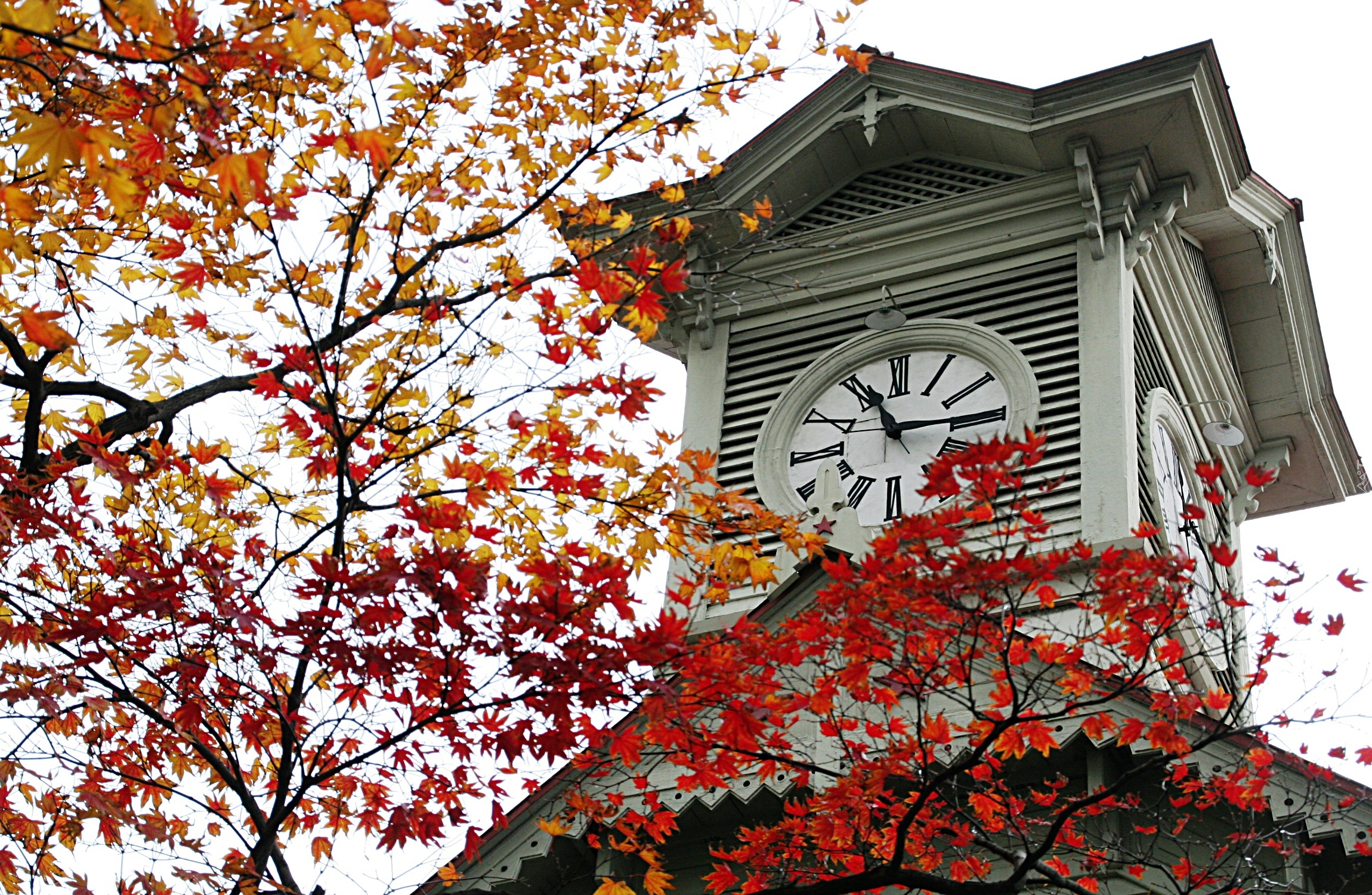 Edytor tapety: wieża zegarowa, Sapporo, Japonia, liście, jesień