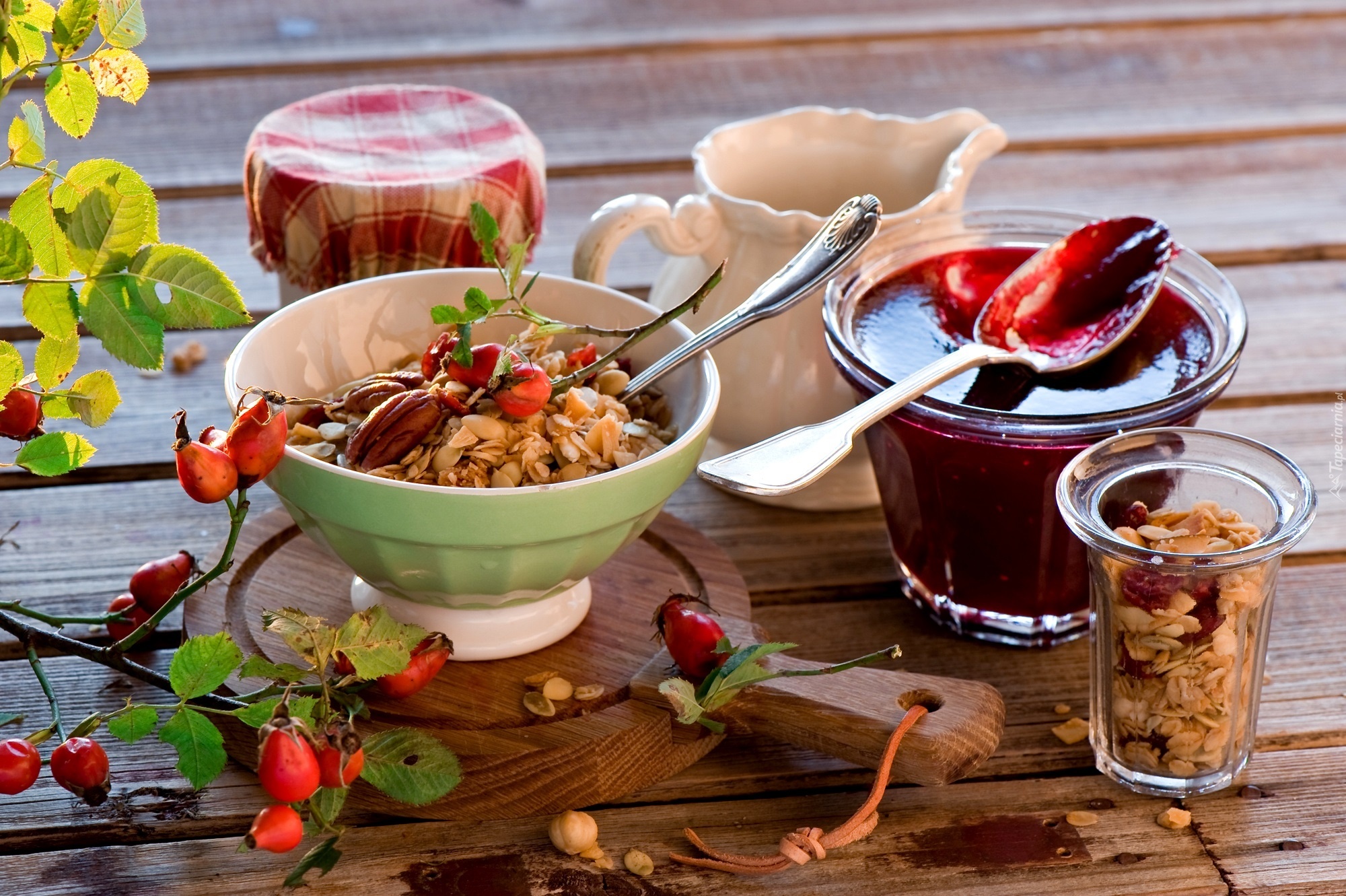 Edytor tapety: Musli, Powidła, Miseczka, Szklanka, Śniadanie
