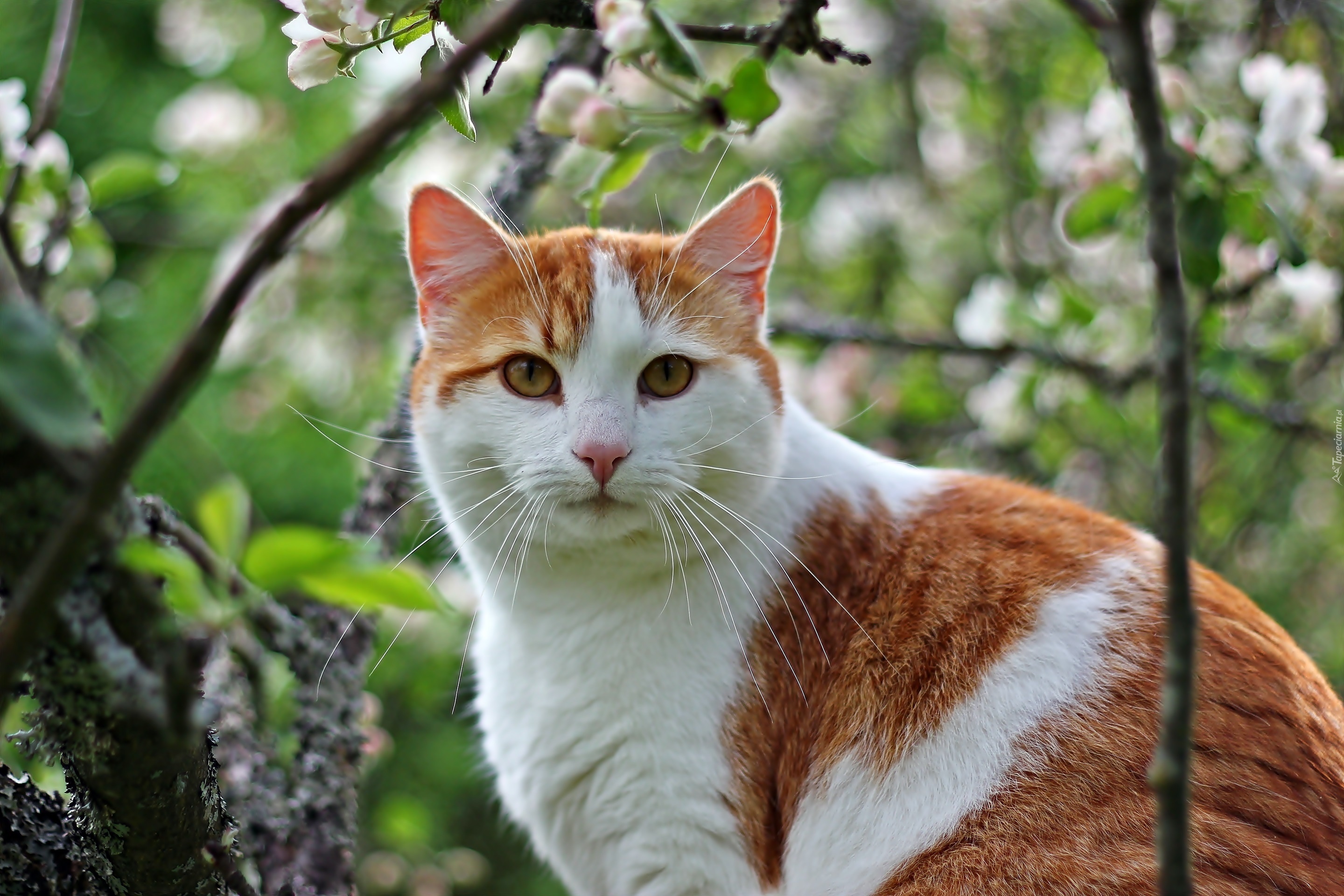 Edytor tapety: Kot, Biało, Rudy, Kwitnące, Drzewo, Rozmycie