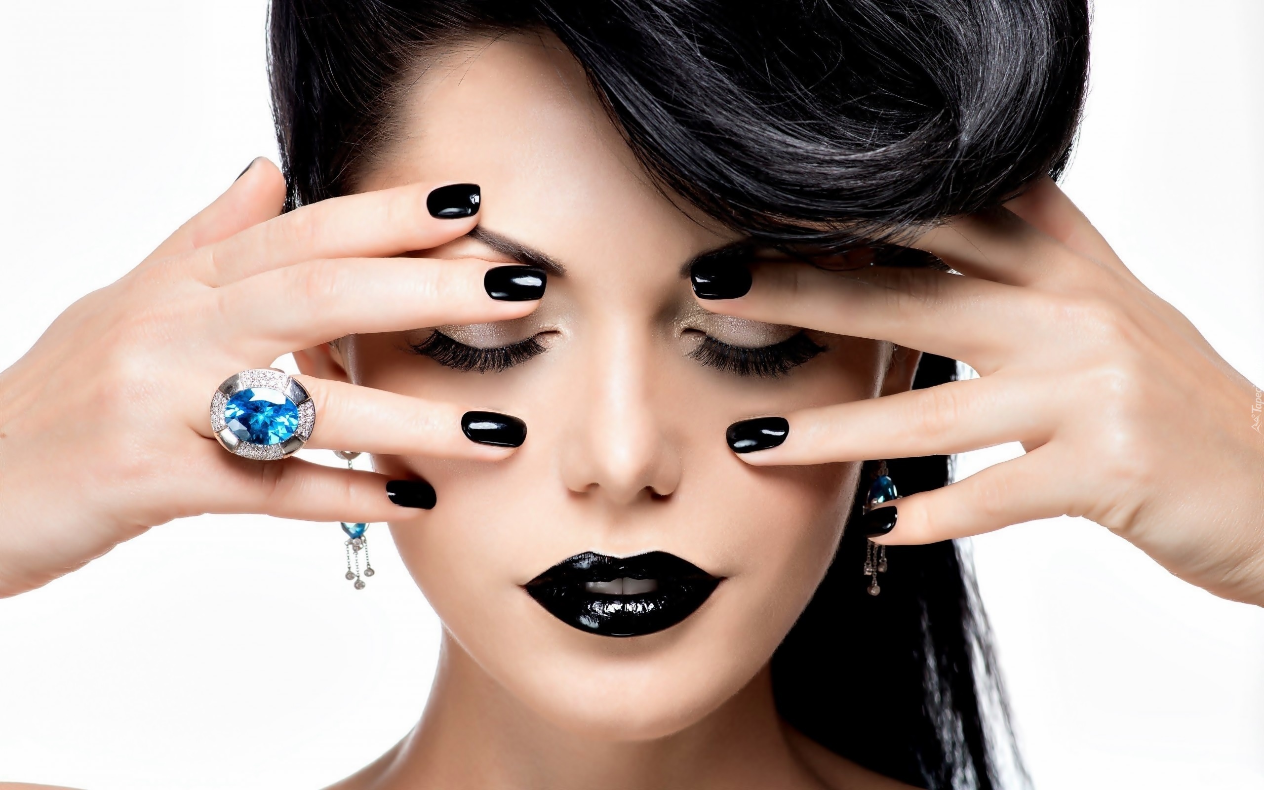 Edytor tapety: Kobieta, Modelka, Twarz, Dłonie, Czarny, Makijaż, Biżuteria