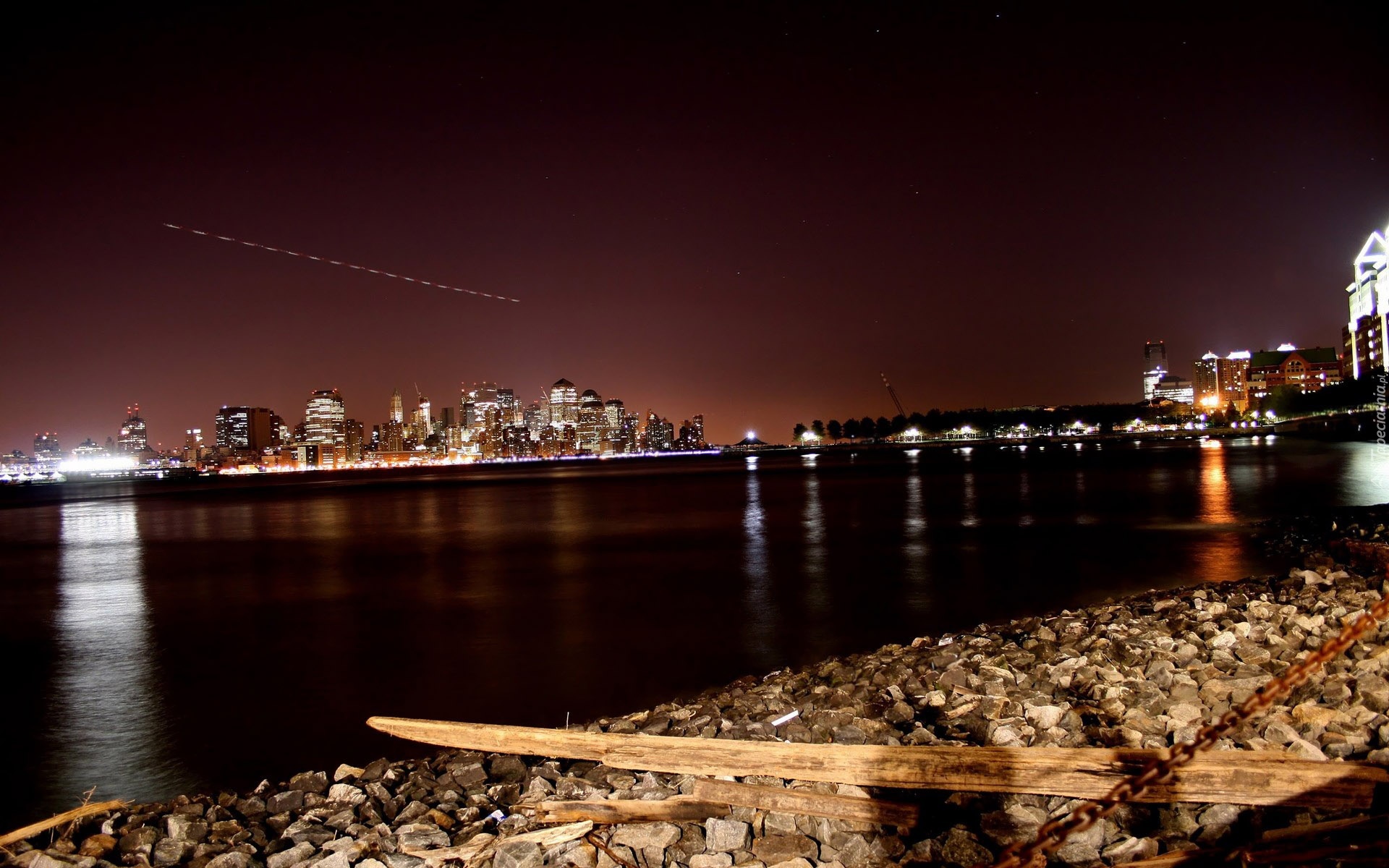 Edytor tapety: Miasto, Noc, Rzeka, Brzeg, Kamienie