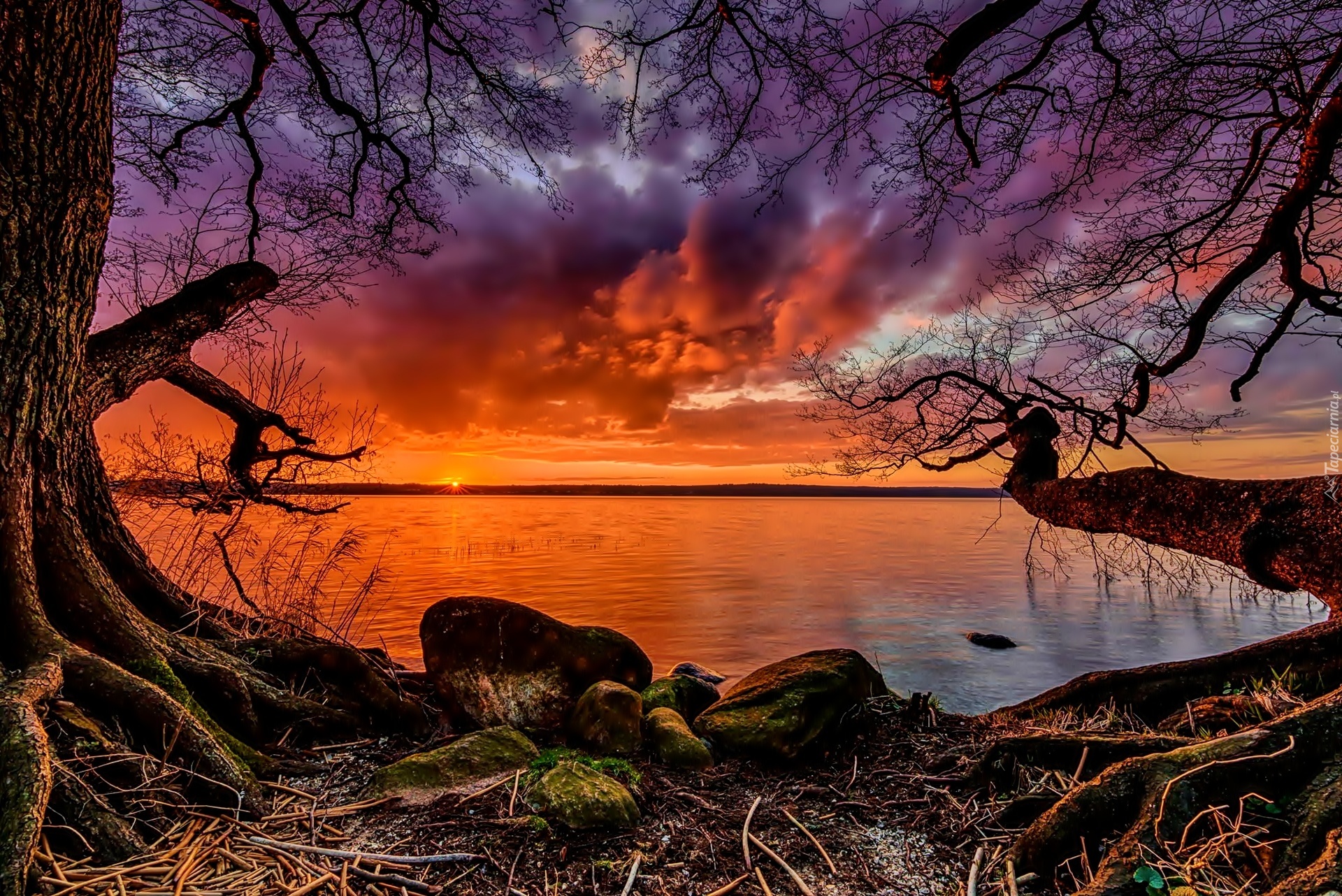 Edytor tapety: Jezioro, Zachód, Słońca, Drzewa, Kamienie