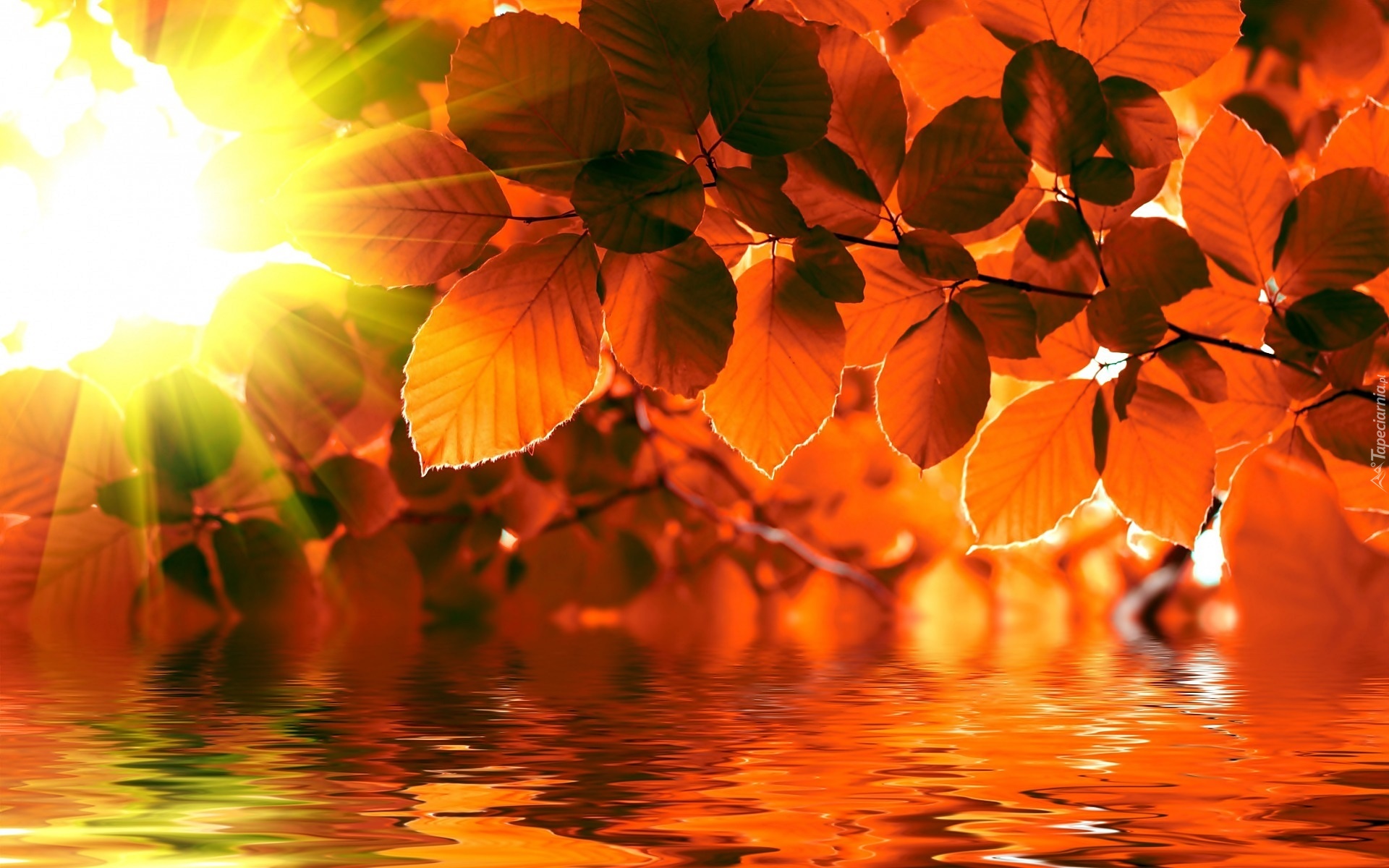 Edytor tapety: Jesień, Liście, Woda, Promienie słońca