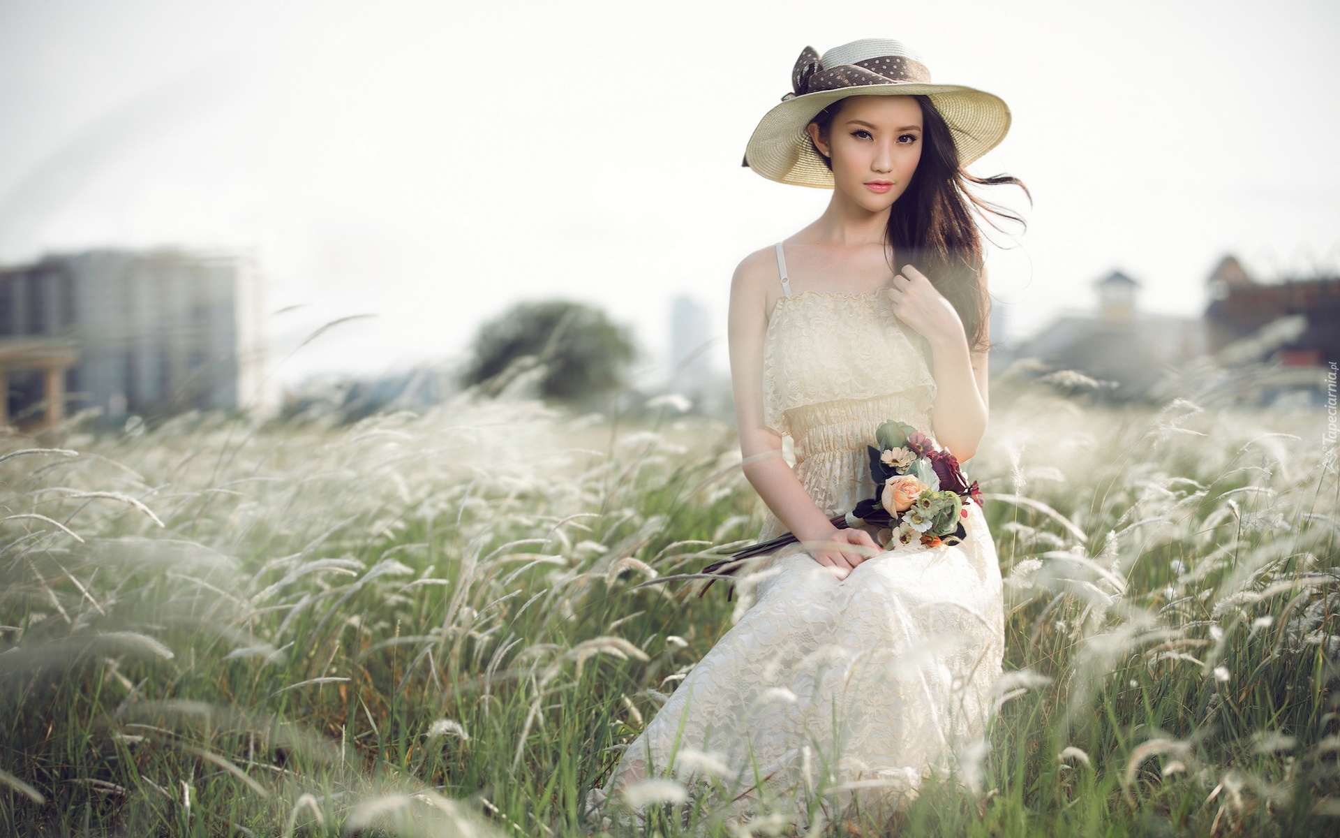 Edytor tapety: Brunetka, Moda, Styl, Kapelusz, Bukiet, Kwiatów, Łąka, Trawa