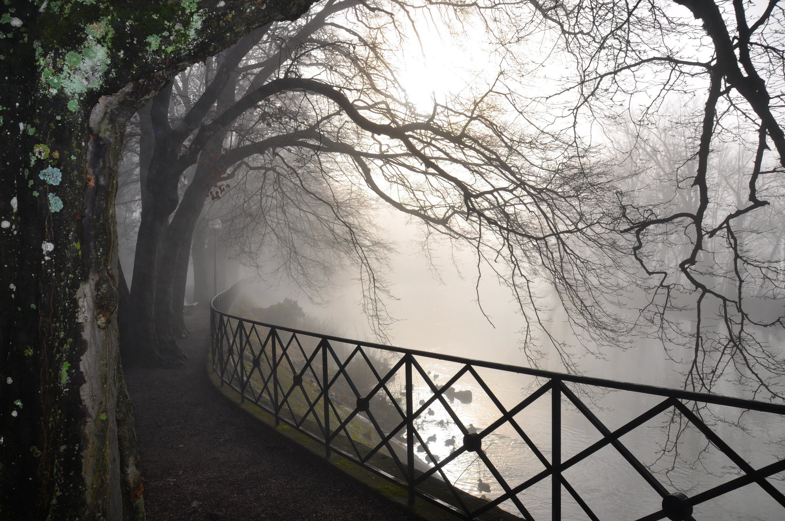 Edytor tapety: Drzewa, Gałęzie, Mgła, Rzeka, Las