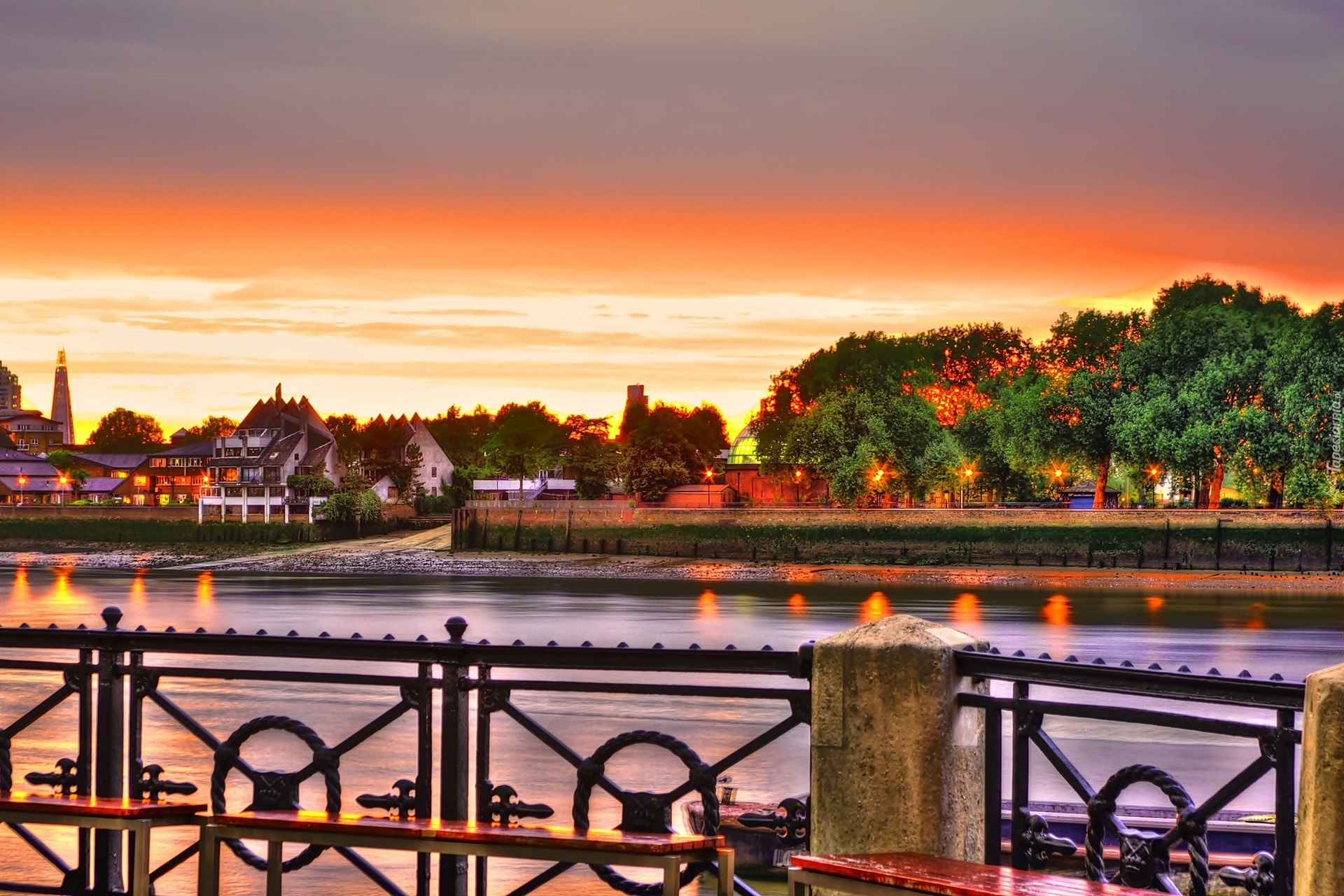 Edytor tapety: Rzeka, Domy, Zachód słońca, Balustrada Anglia, HDR