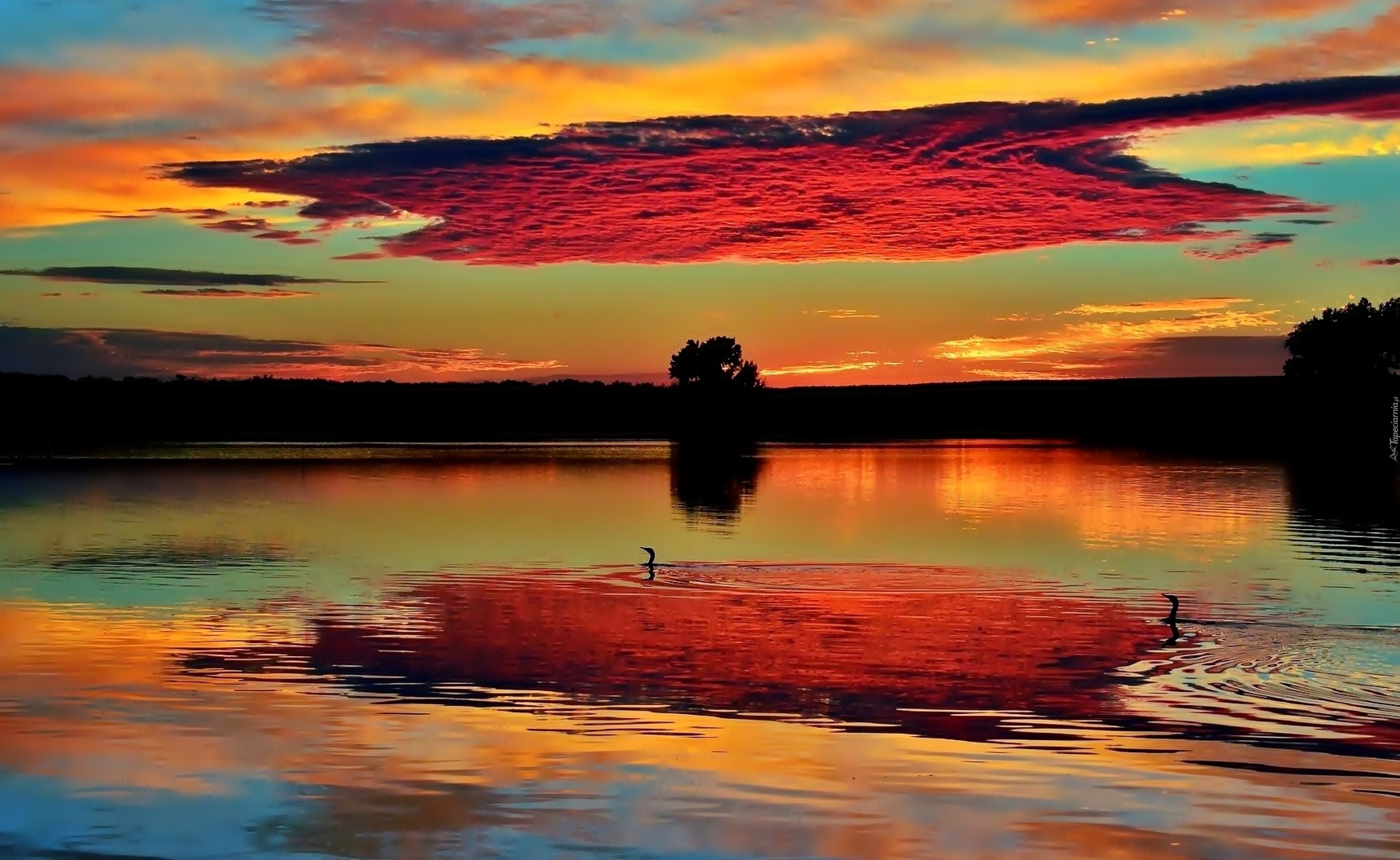 Edytor tapety: Jezioro, Zachód, Słońca, Chmury, Odbicie