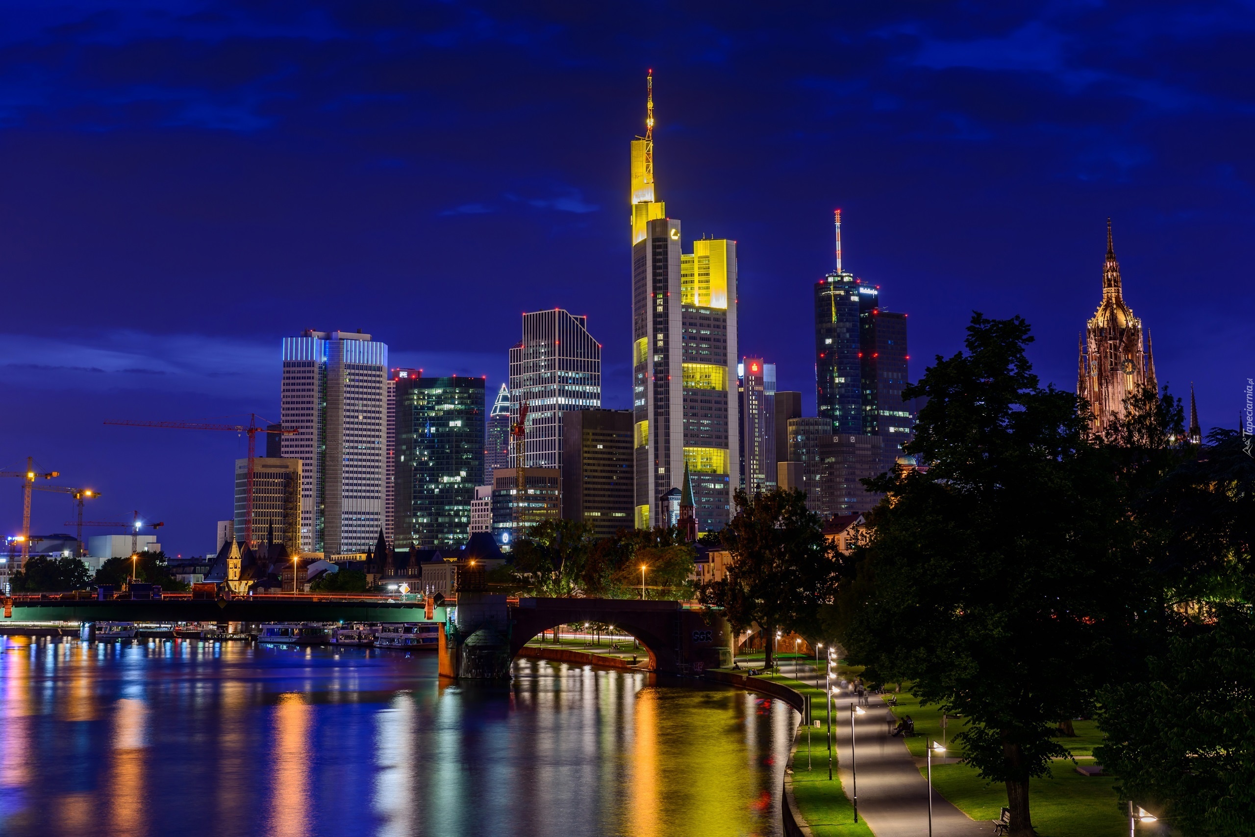 Edytor tapety: Most, Rzeka, Wieżowce, Miasto nocą, Frankfurt, Niemcy
