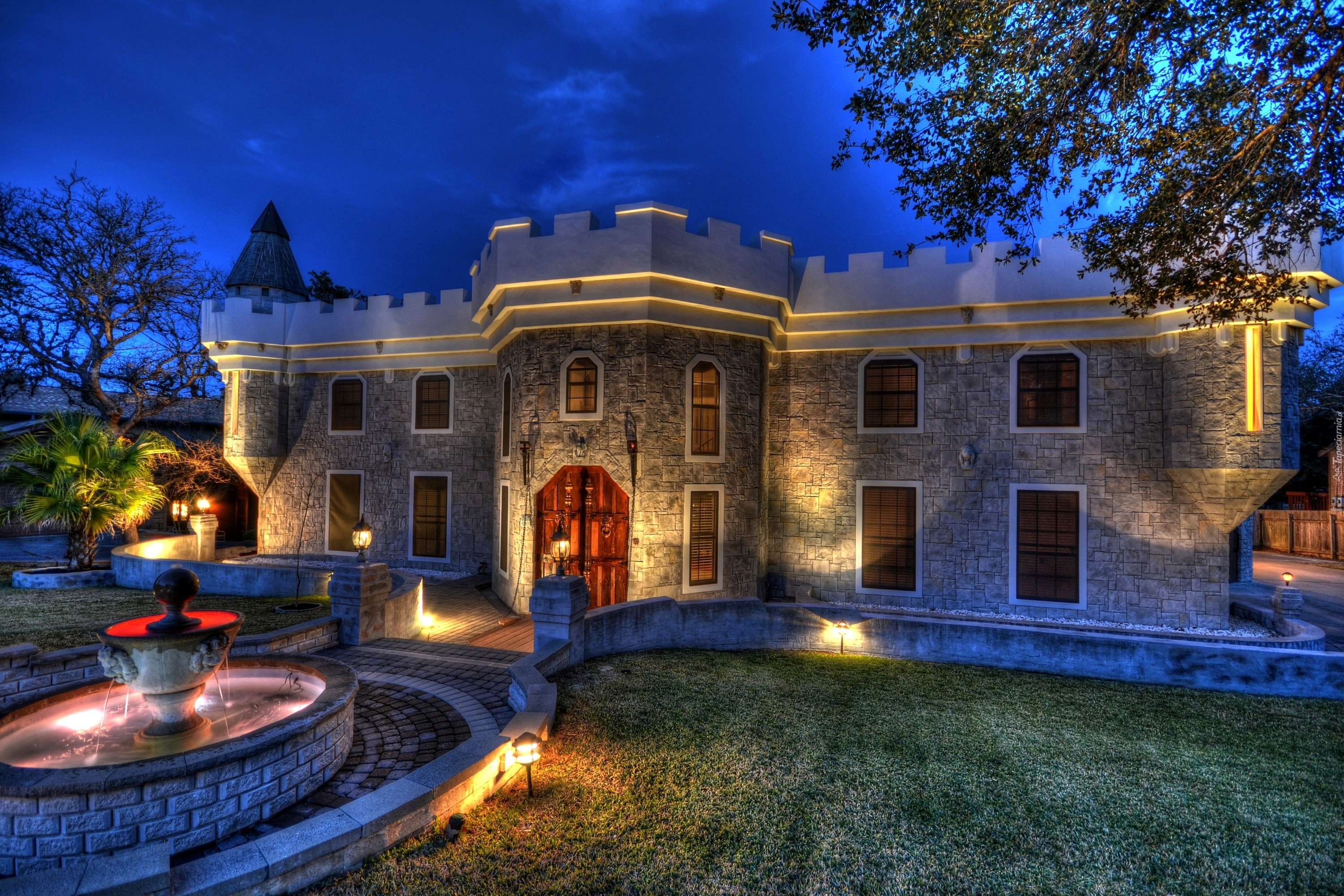Edytor tapety: Oświetlony, Dom, Fontanna, Zmrok, HDR