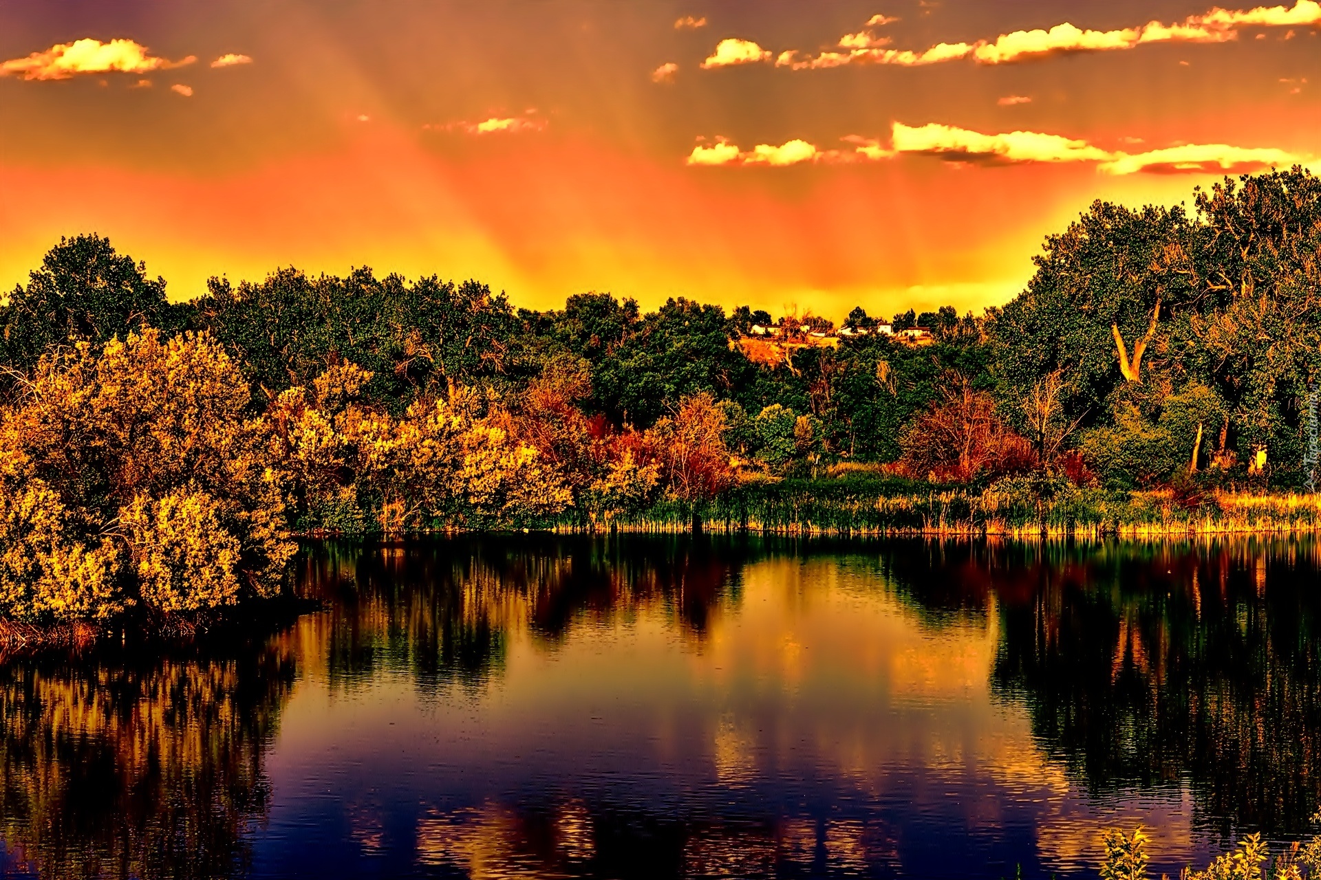 Edytor tapety: Jezioro, Zachód, Słońca, Jesień, Drzewa