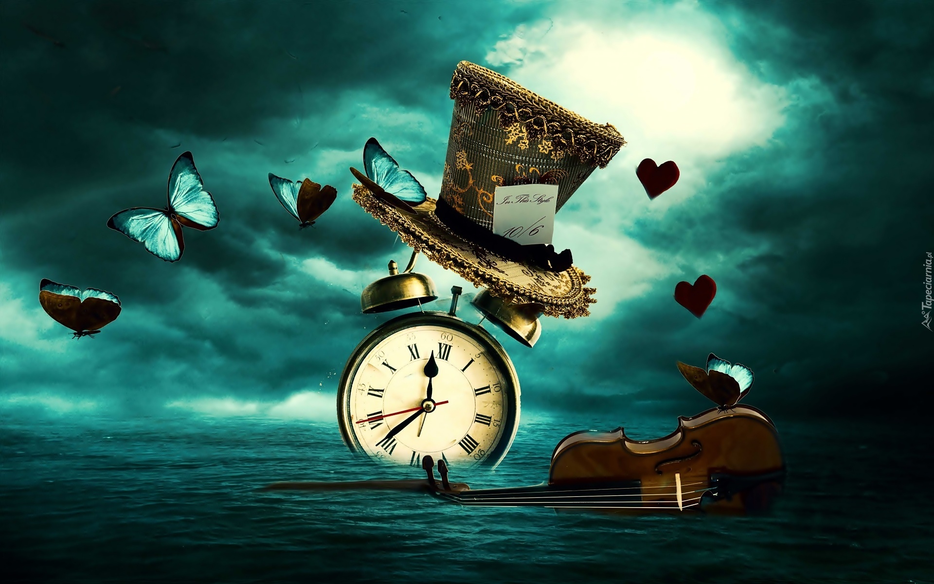 Edytor tapety: Grafika, Morze, Budzik, Kapelusz, Skrzypce