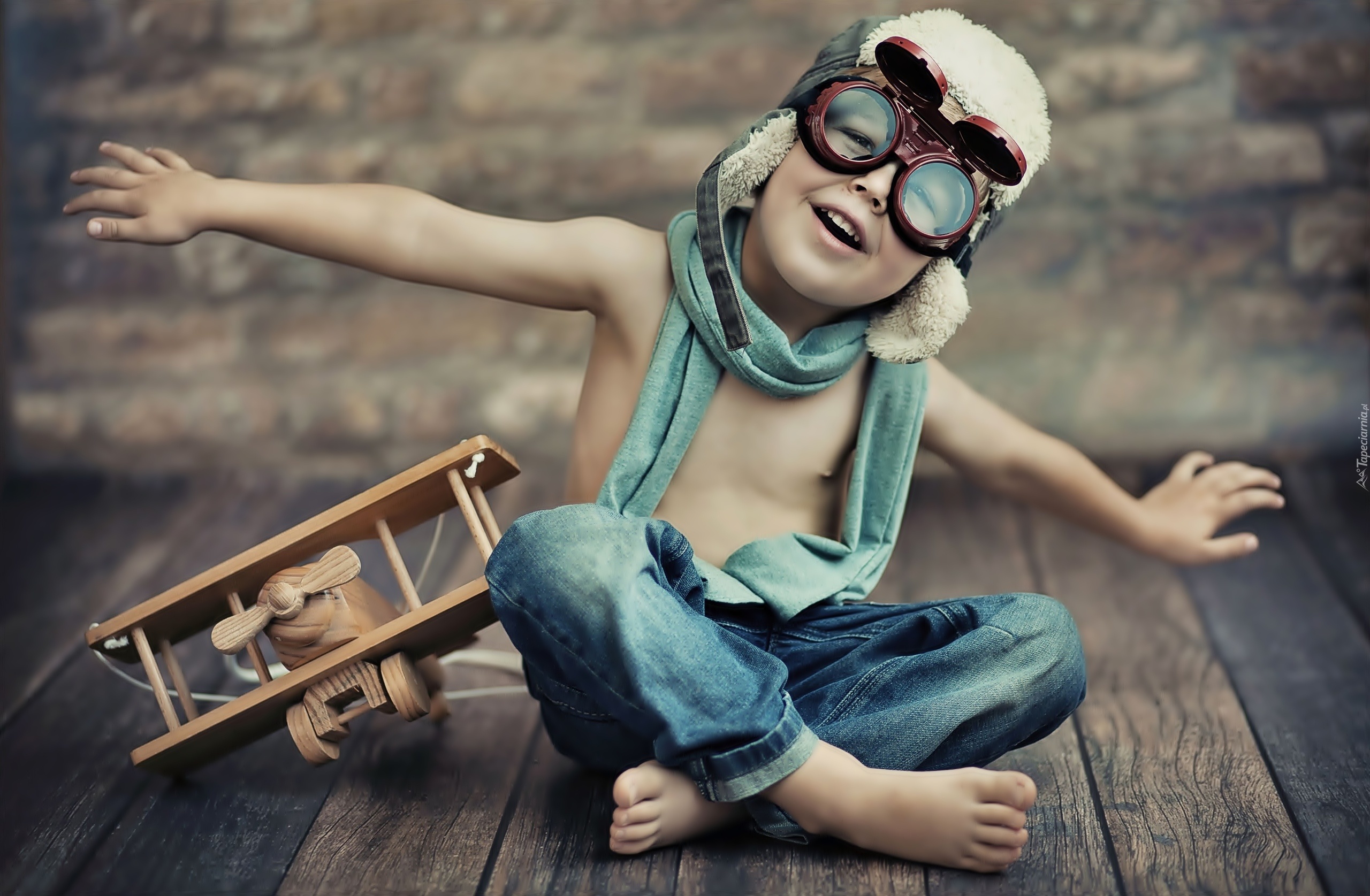 Edytor tapety: Dziecko, Chłopiec, Zabawka, Drewniany, Samolot, Okulary, Czapka