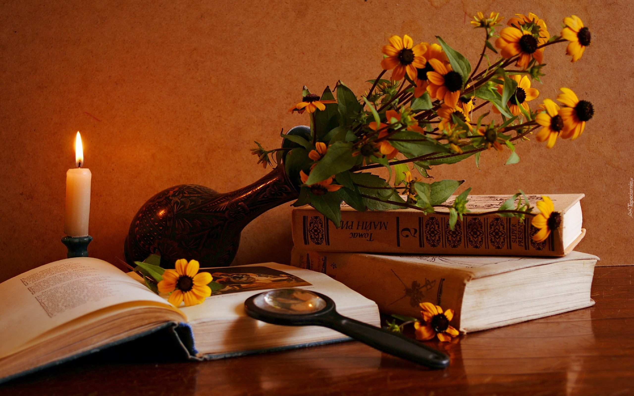 Edytor tapety: Rudbekie, Flakon, Książki, Świeczka, Kompozycja