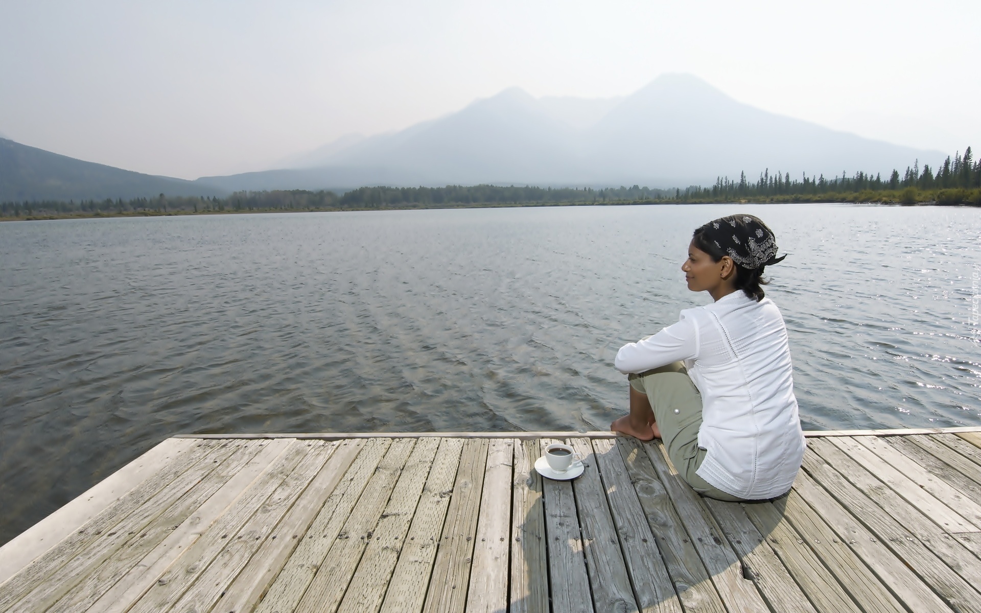 Edytor tapety: Kobieta, Pomost, Jezioro, Filiżanka, Kawa