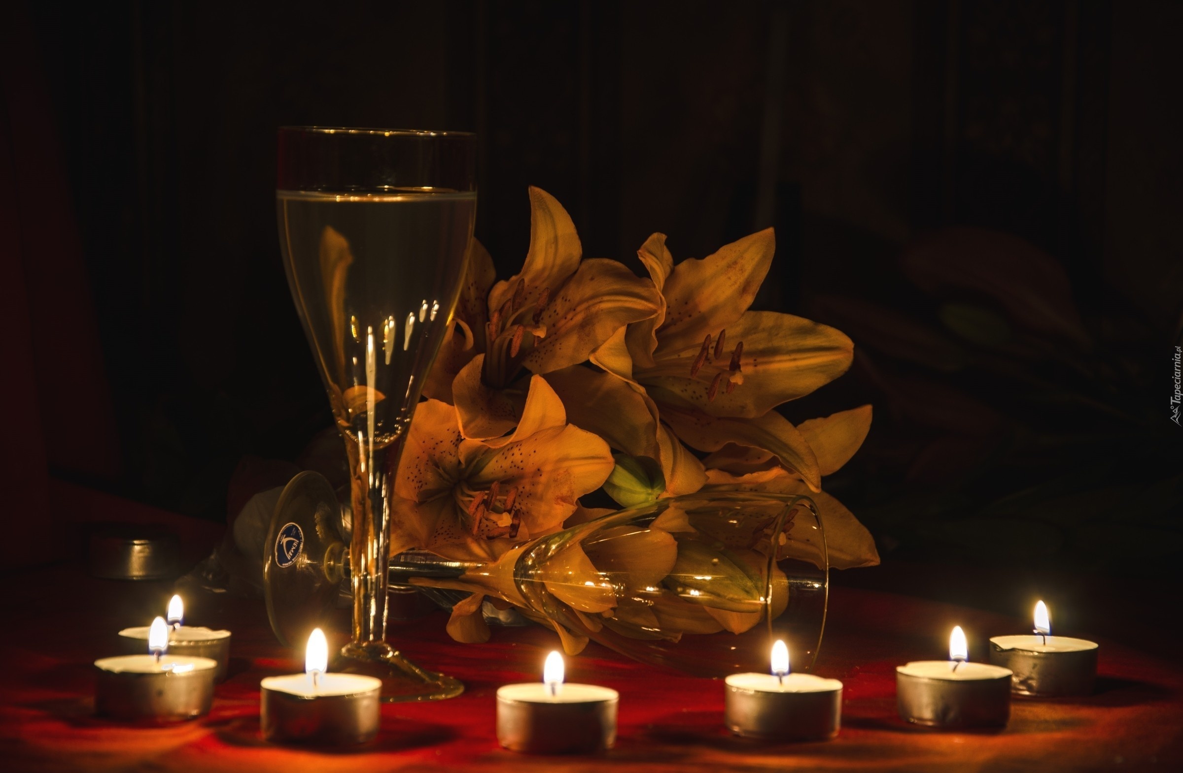 Edytor tapety: Kompozycja, Świeca, Lilia tygrysia, Wino, Kieliszki