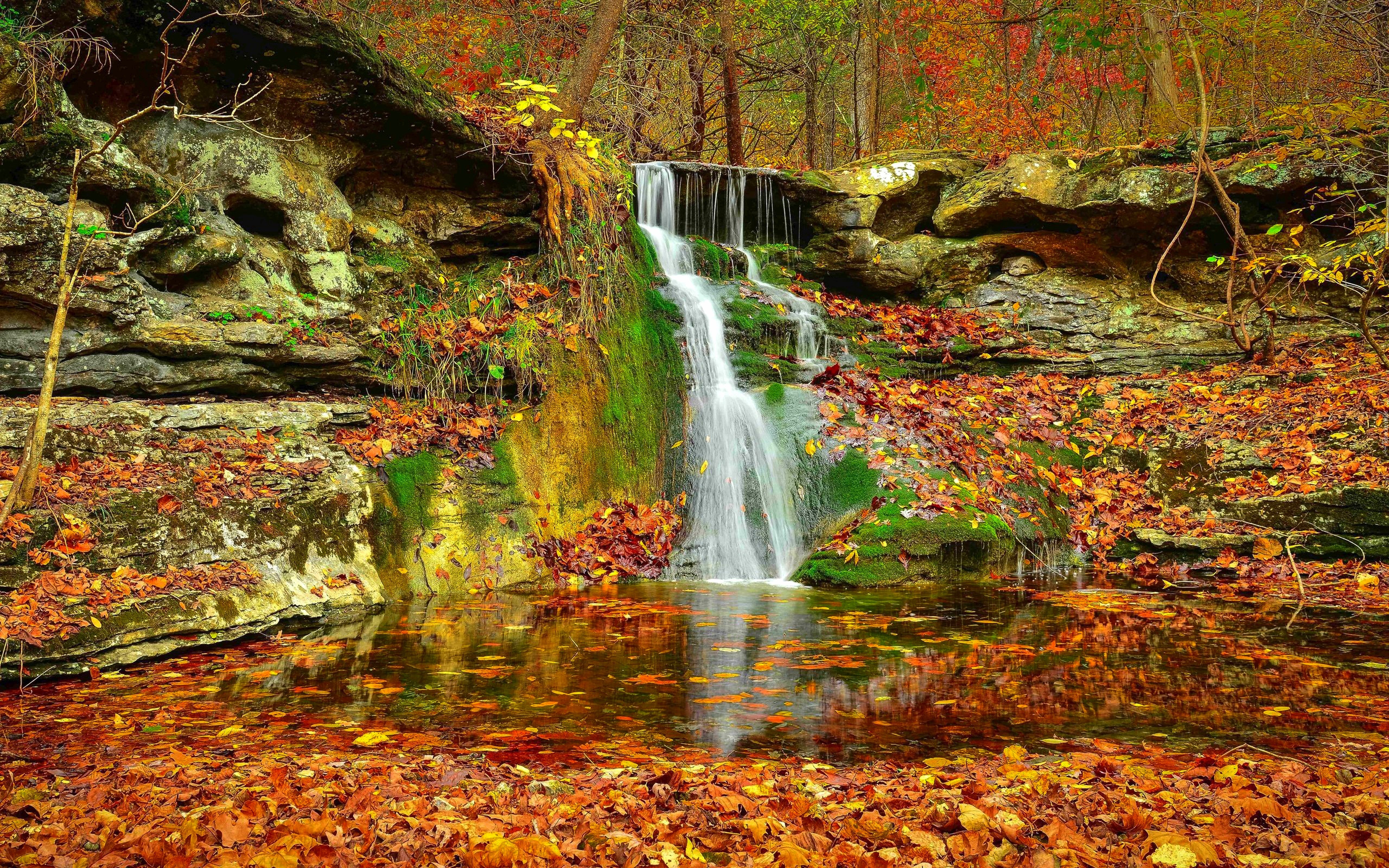 Edytor tapety: Jesień, Wodospad, Skały, Liście