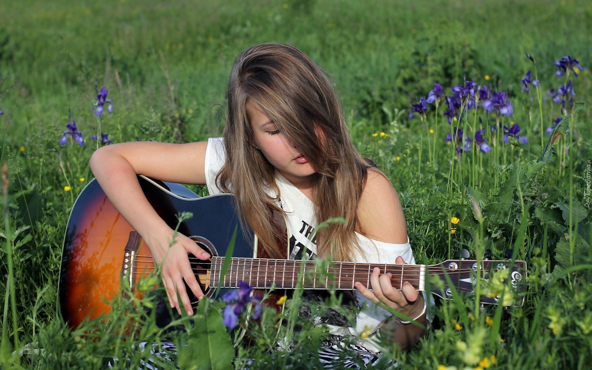Edytor tapety: Łąka, Trawa, Kwiaty, Dziewczyna, Gitara