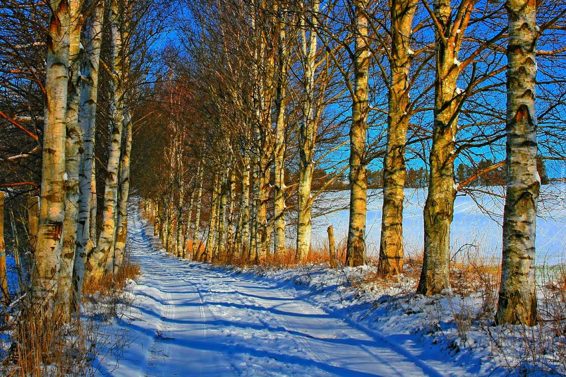 Edytor tapety: Zima, Śnieg, Droga, Brzozy