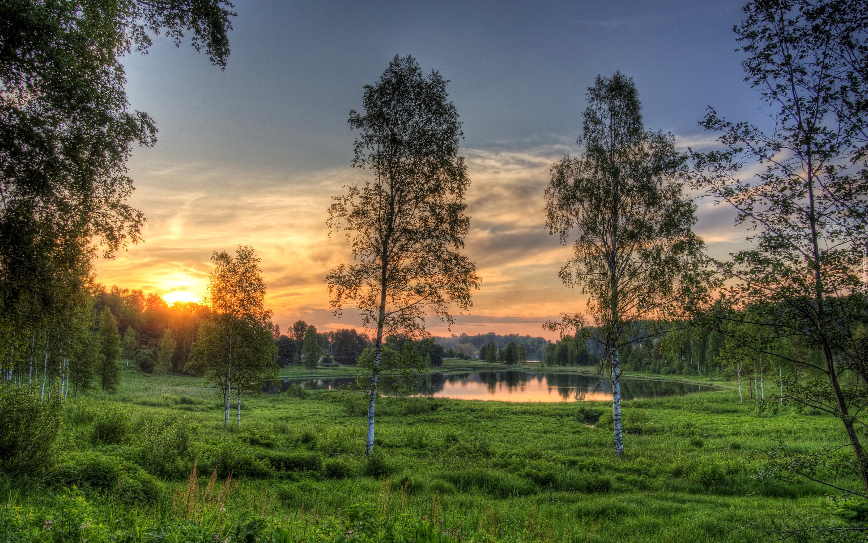 Edytor tapety: Park, Zachód, Słońca, Staw, Drzewa, Brzozy