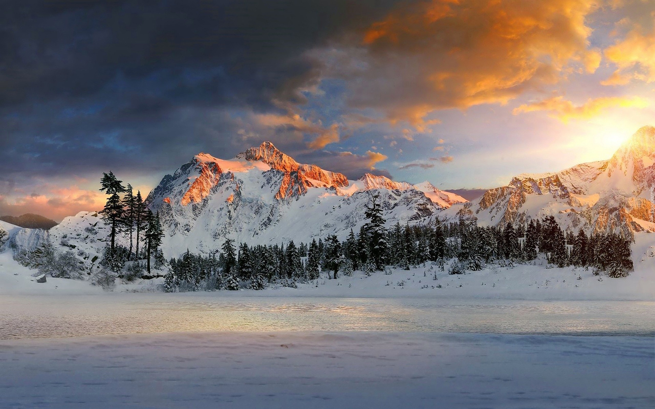 Edytor tapety: Góry, Zima, Zachodzące słońce