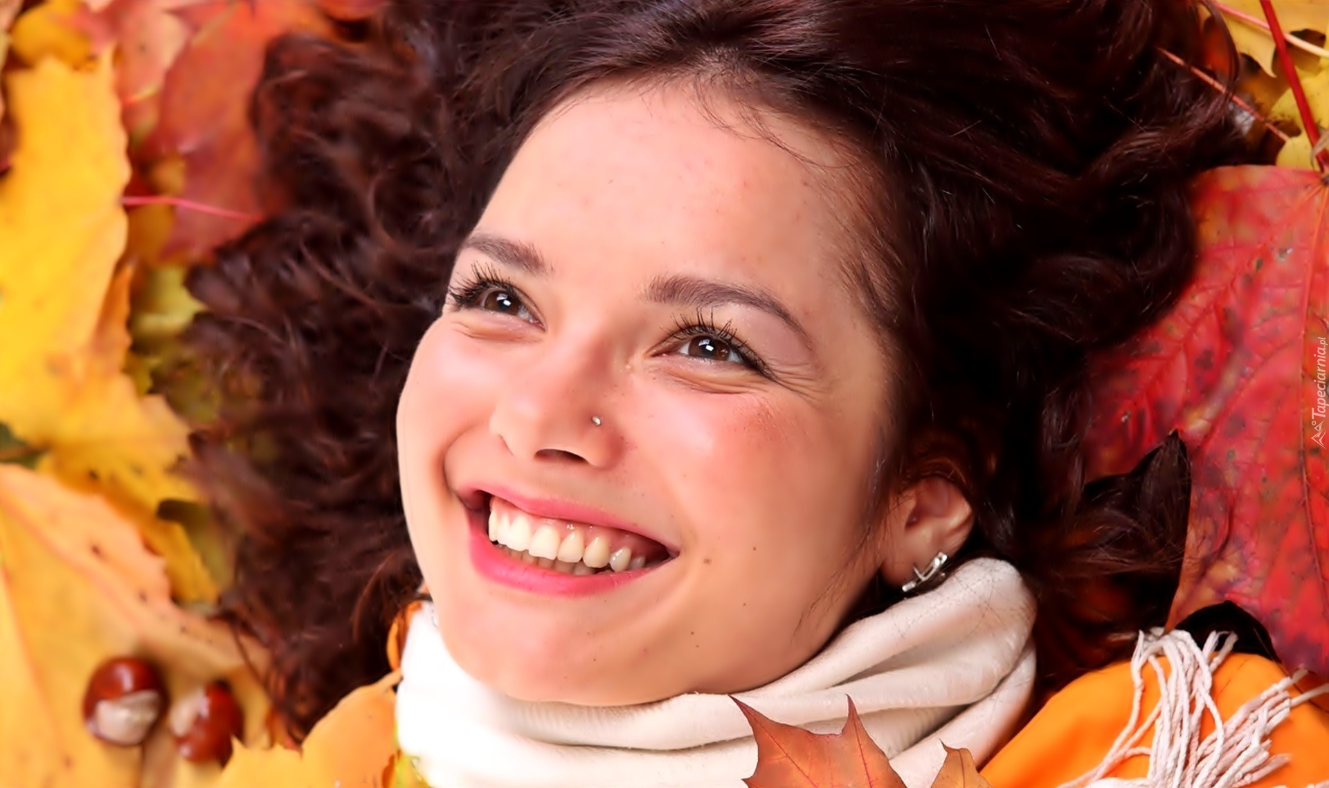 Edytor tapety: Kobieta, Uśmiech, Liście, Kasztany