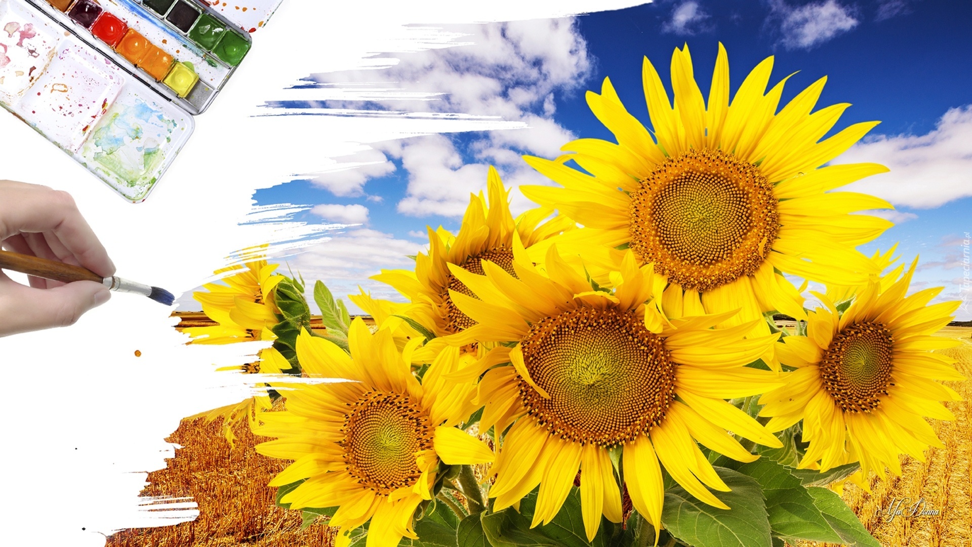 Edytor tapety: Słoneczniki, Farbki, Niebo, Chmury