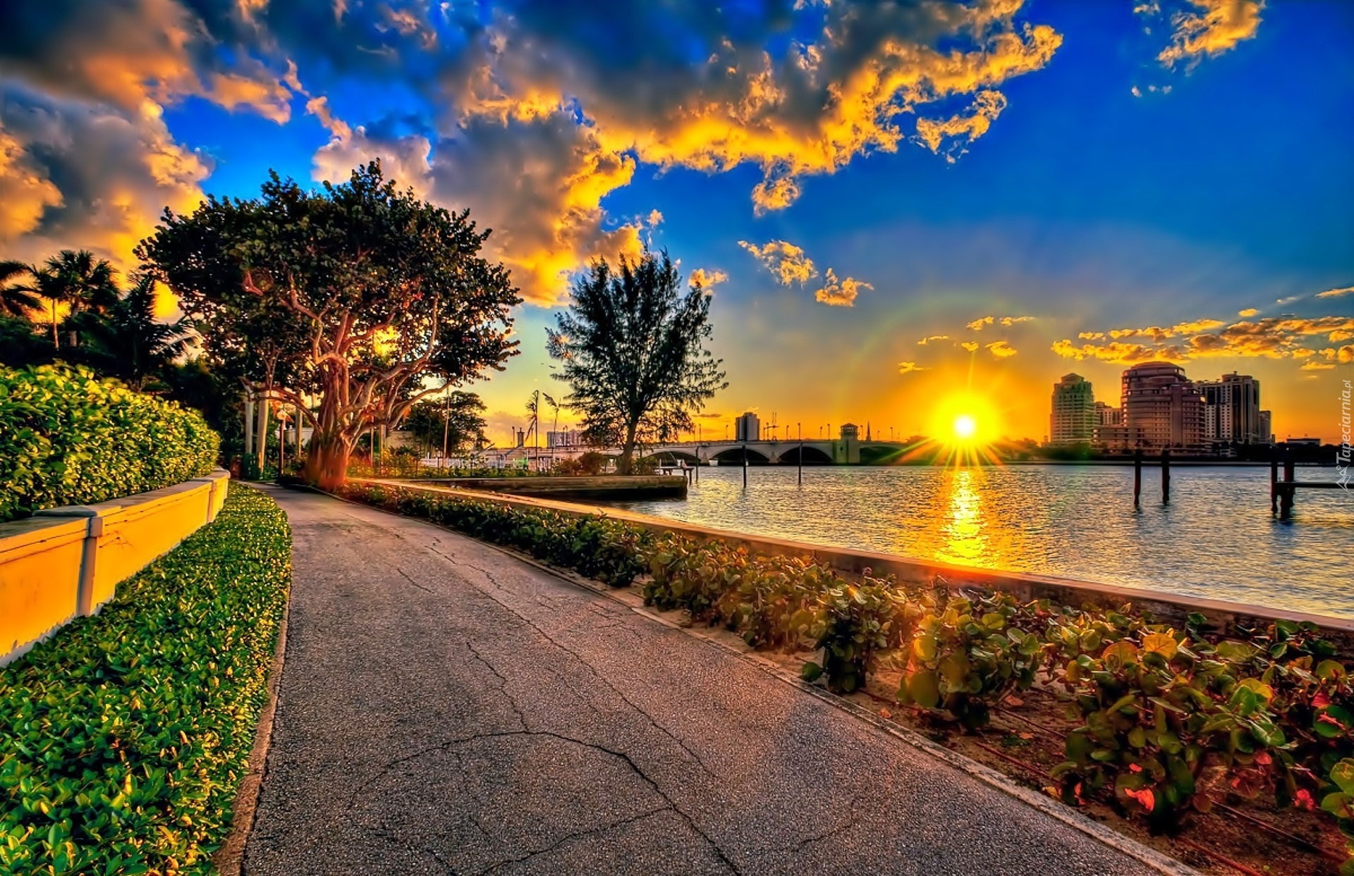 Edytor tapety: Zachód Słońca, Rzeka, Most, Droga, Drzewa, Miasto