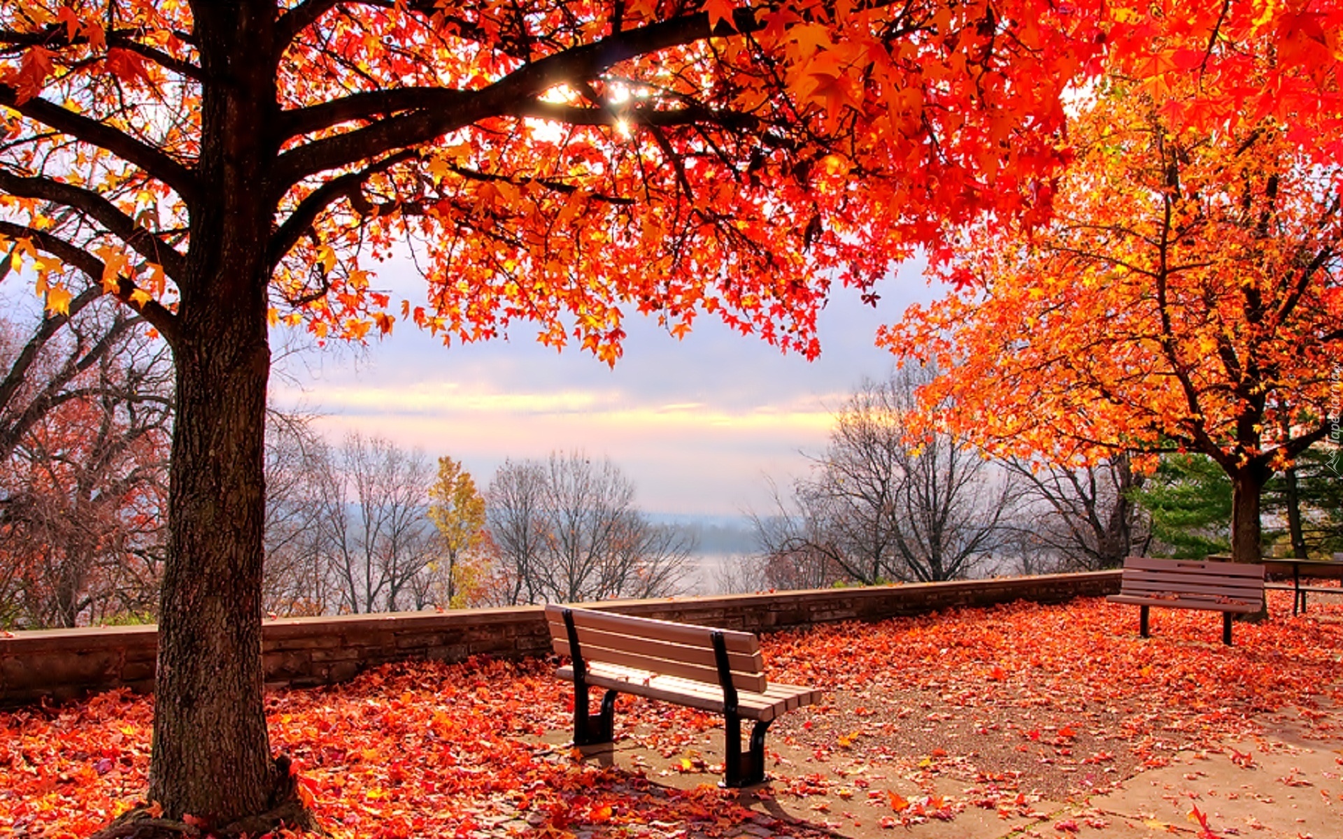 Edytor tapety: Jesień, Park, Rzeka, Ławki