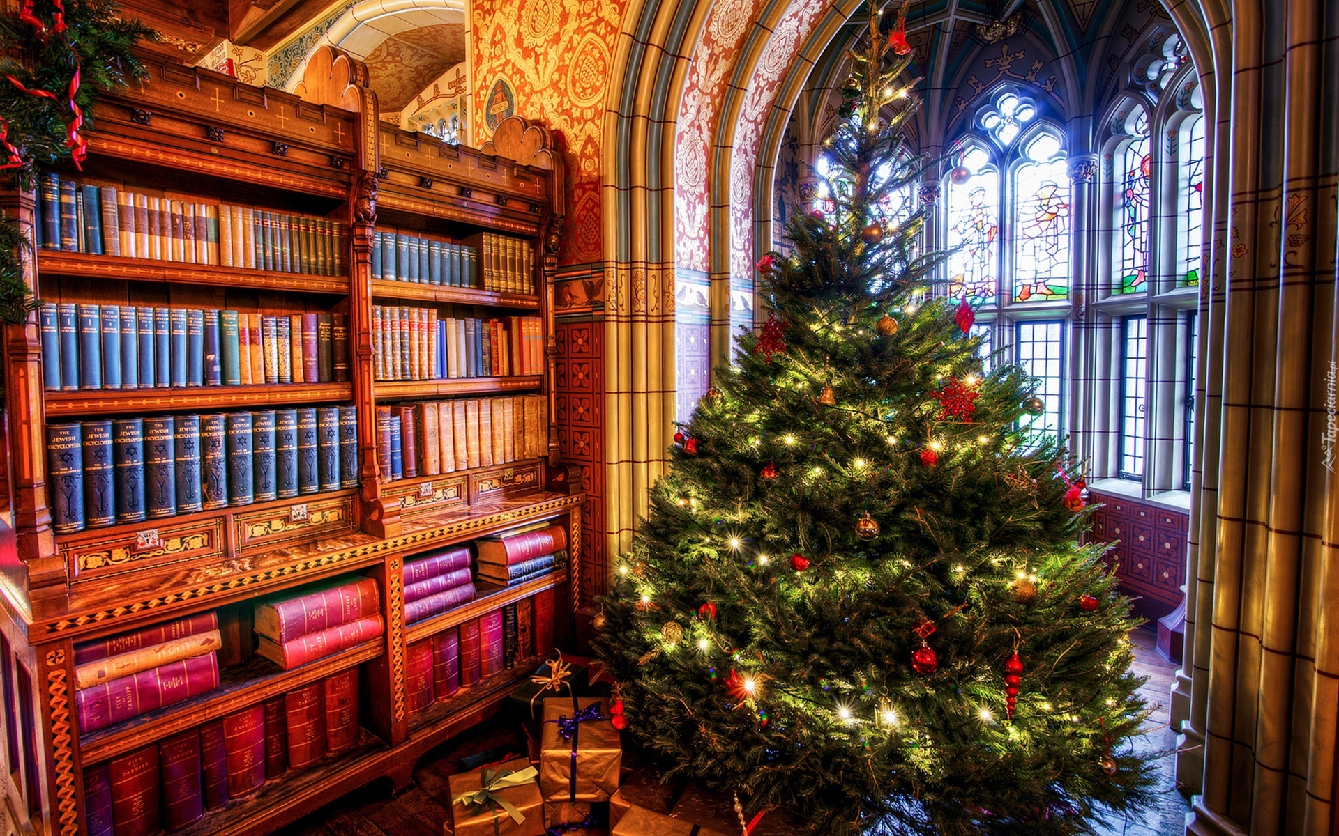 Edytor tapety: Wnętrze, Książki, Choinka, Prezenty