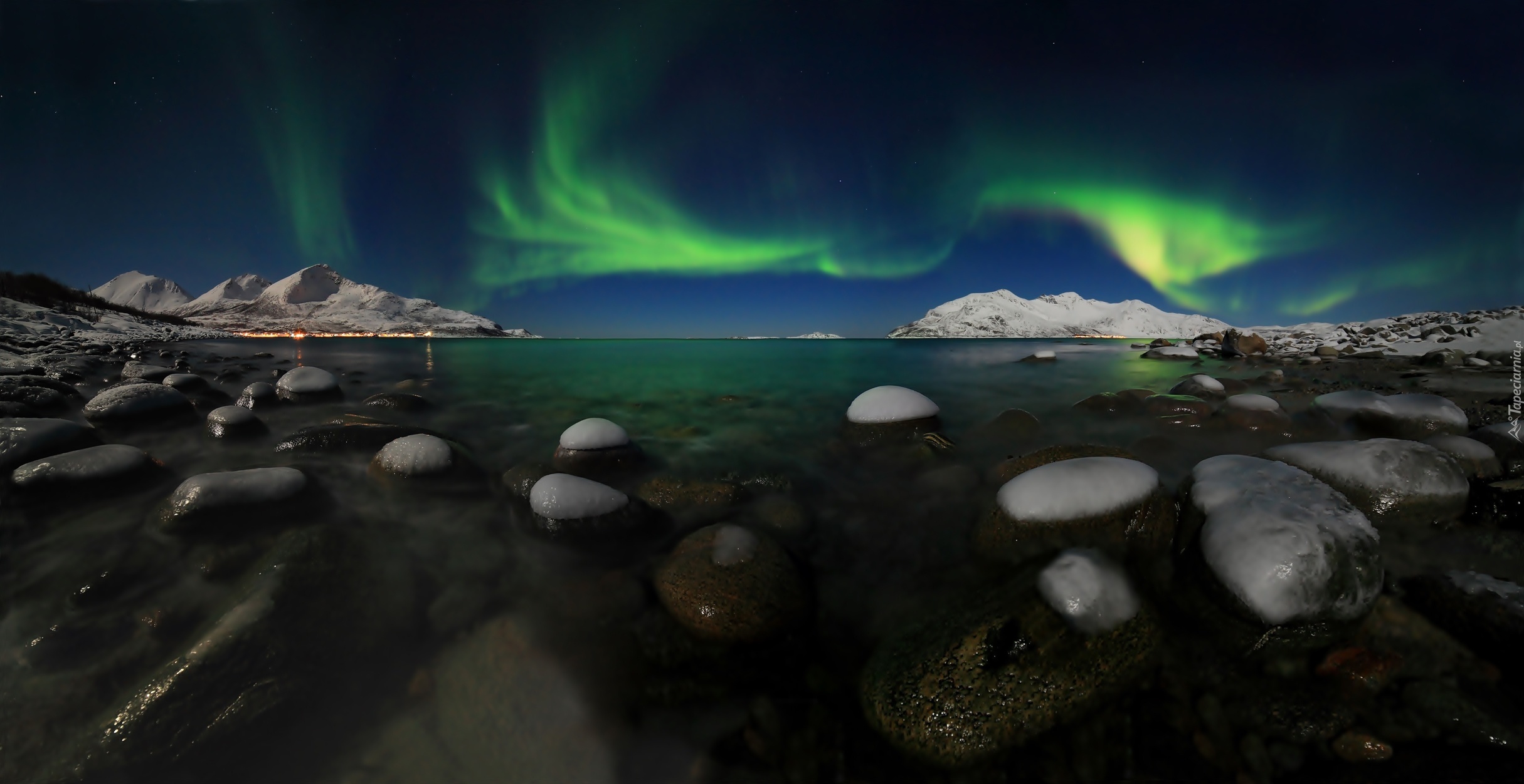 Edytor tapety: Zorza polarna, Kamienie, Woda