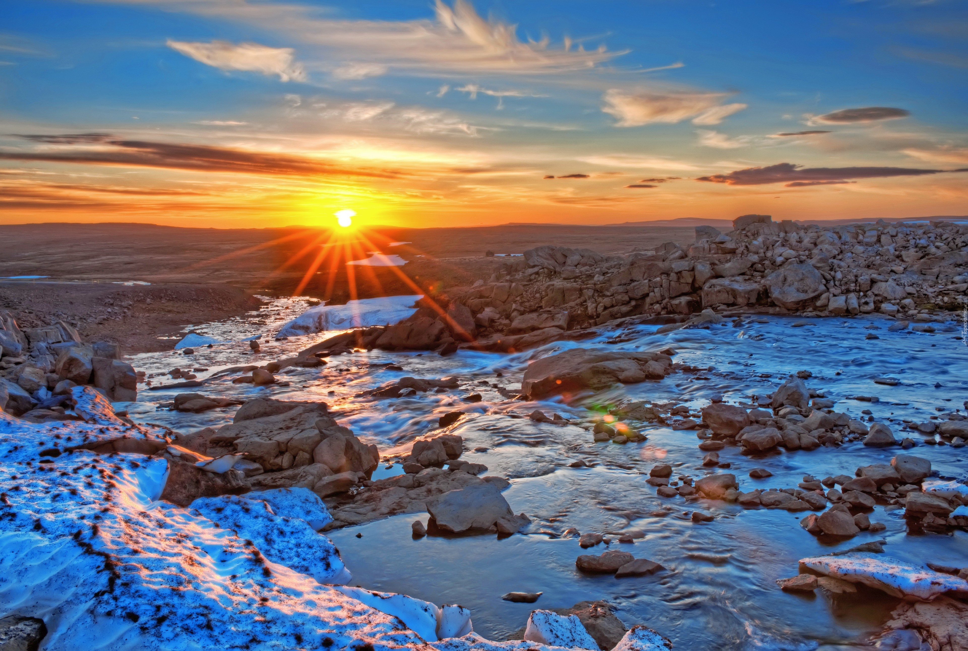 Edytor tapety: Zachód słońca, Kamienie, Zima