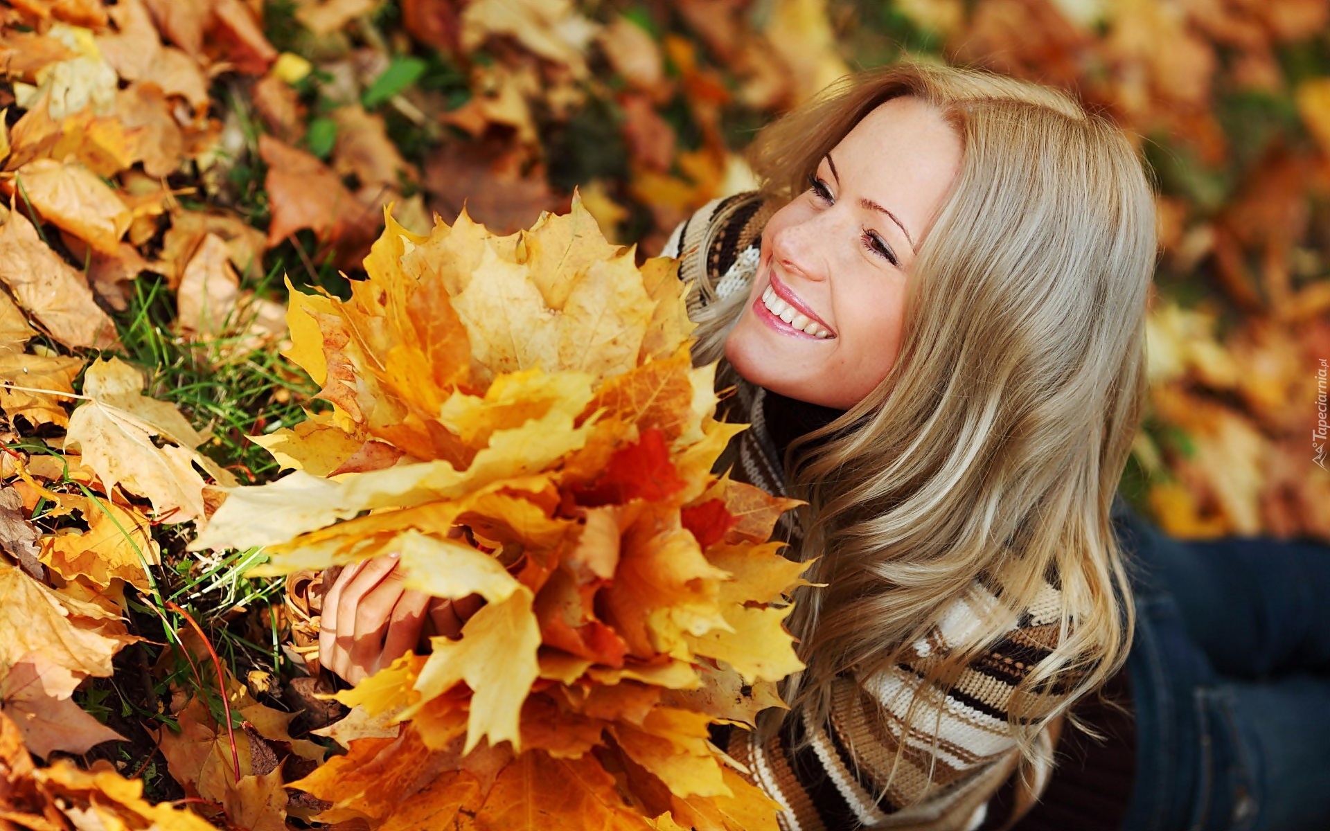 Edytor tapety: Jesień, Uśmiechnięta, Dziewczyna, Liście