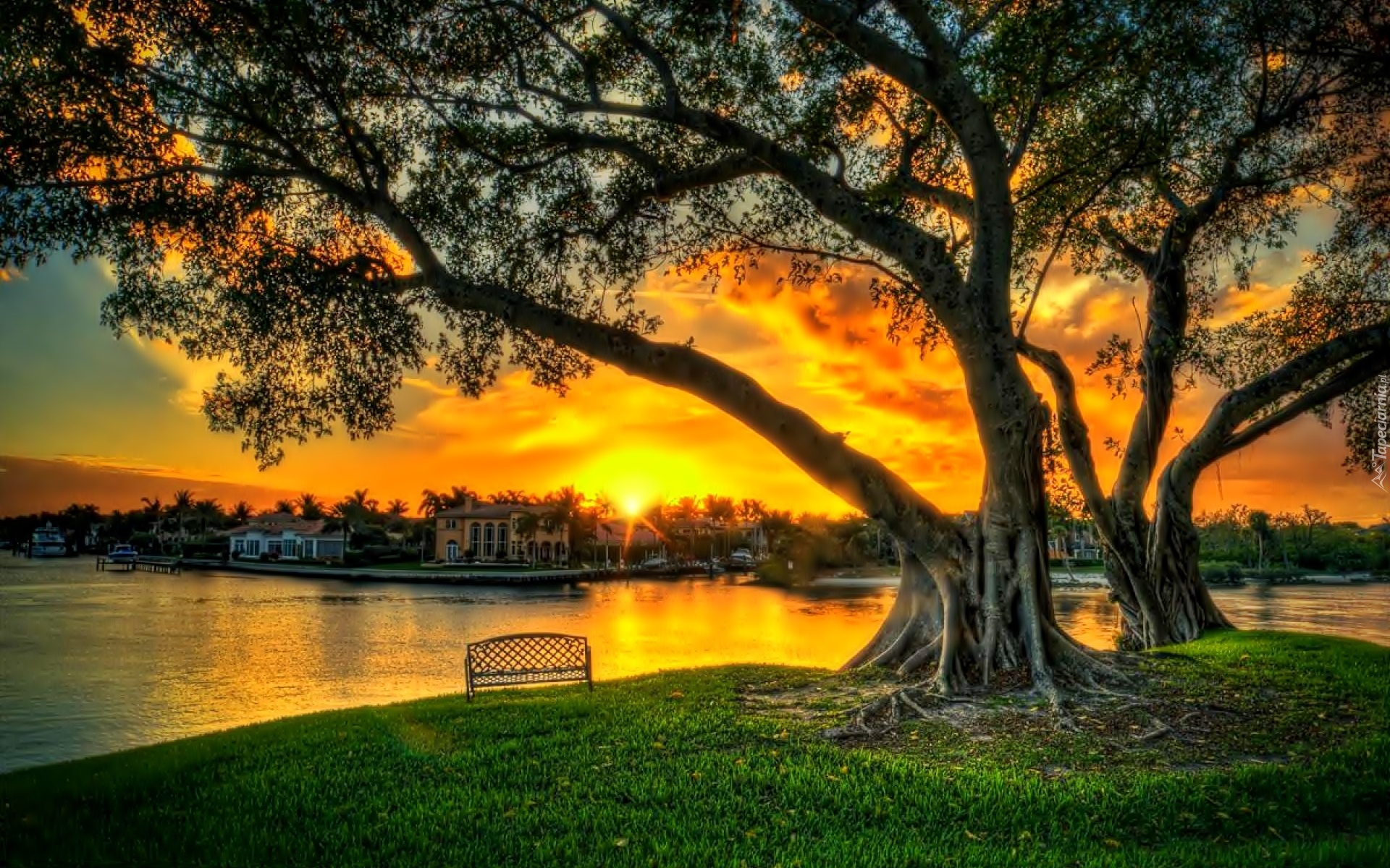 Edytor tapety: Jezioro, Zachód Słońca, Drzewa