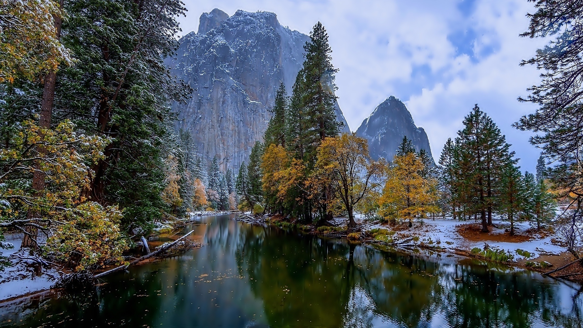 Edytor tapety: Jesień, Góry, Rzeka, Las, Drzewa, Śnieg