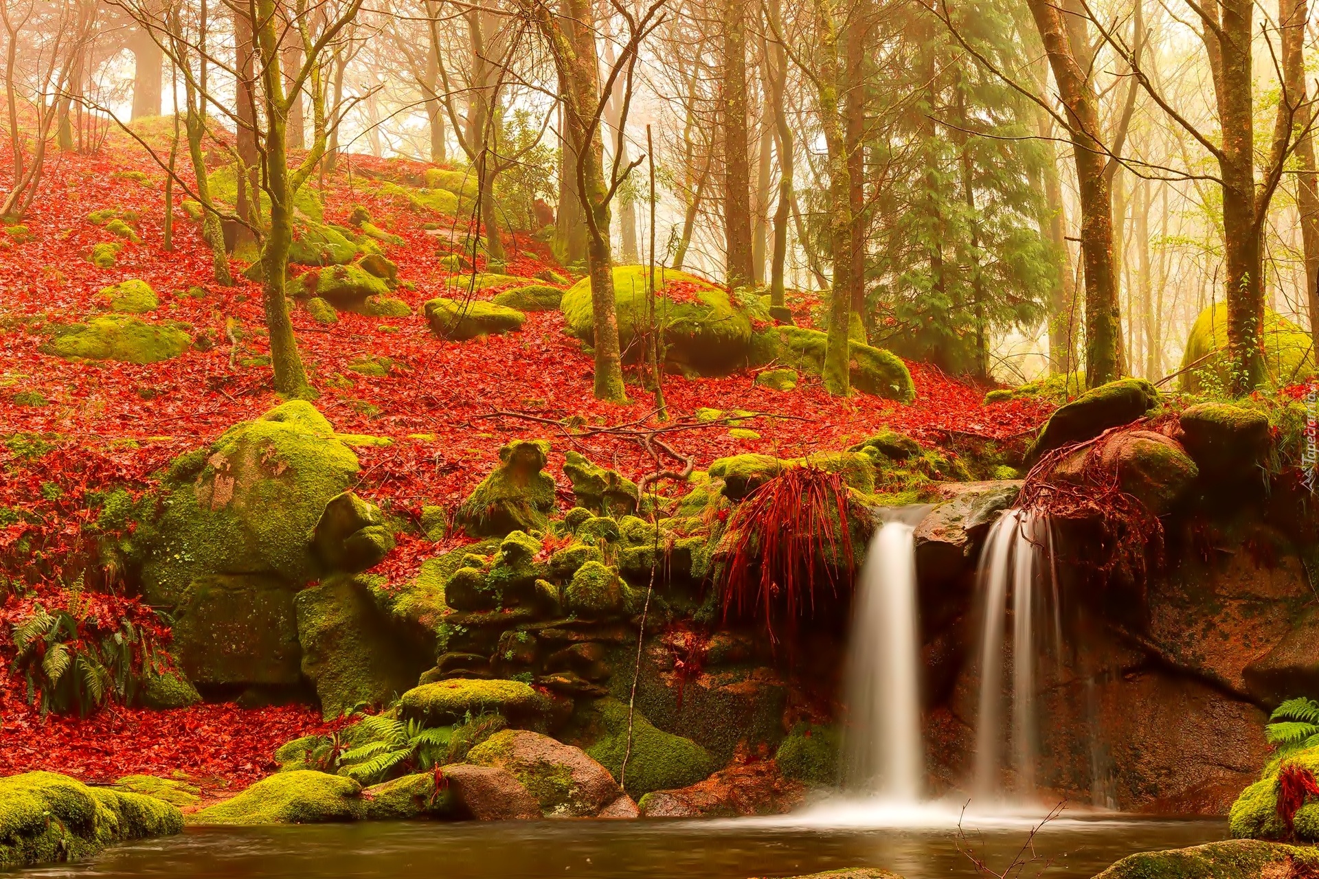 Edytor tapety: Jesień, Las, Liście, Wodospad