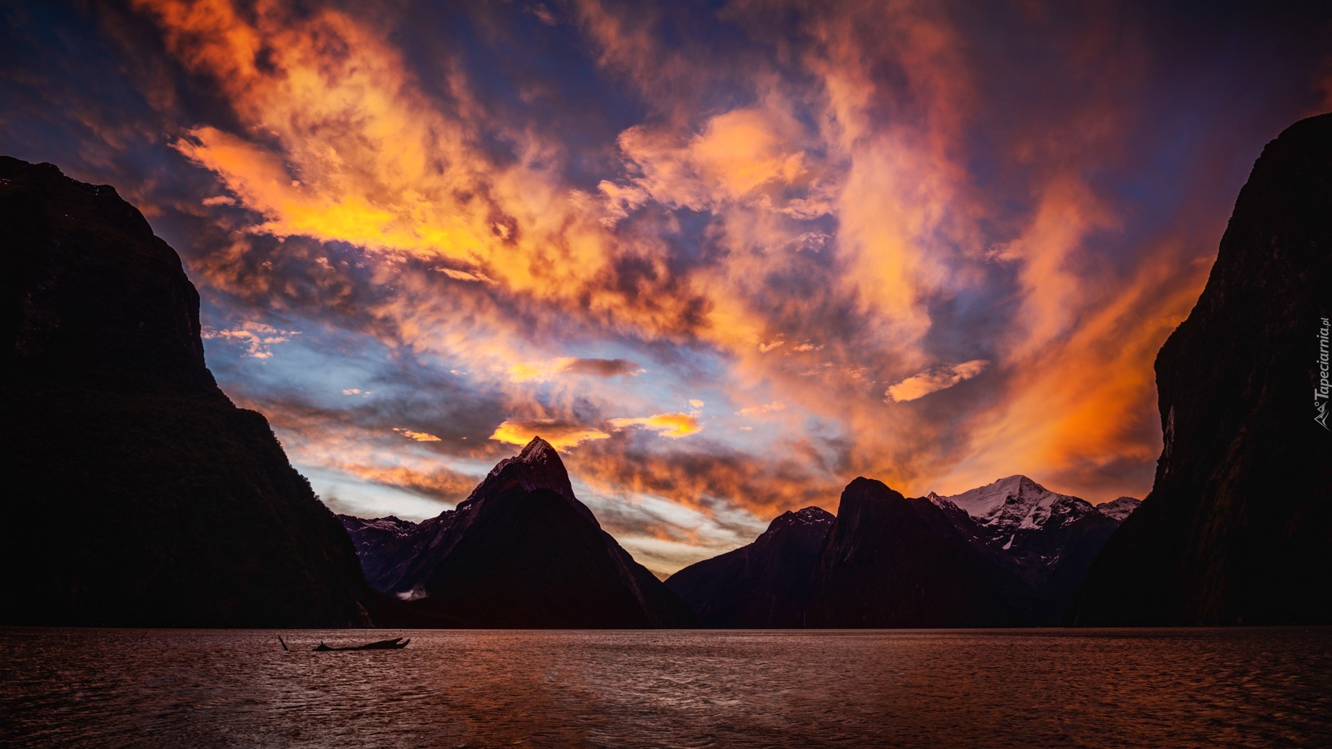 Edytor tapety: Zachód słońca, Skały, Morze Góry