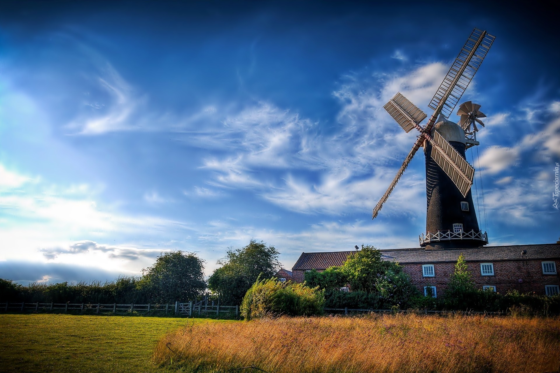 Edytor tapety: Wiatrak, Drzewa, Łąka, Przebijające, Światło