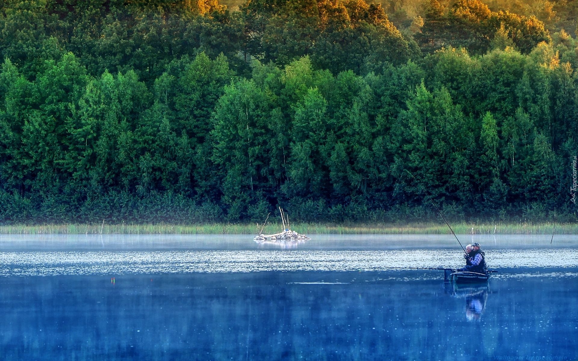 Edytor tapety: Jezioro Piaseczno, Wędkarze, Łódka, Poranek