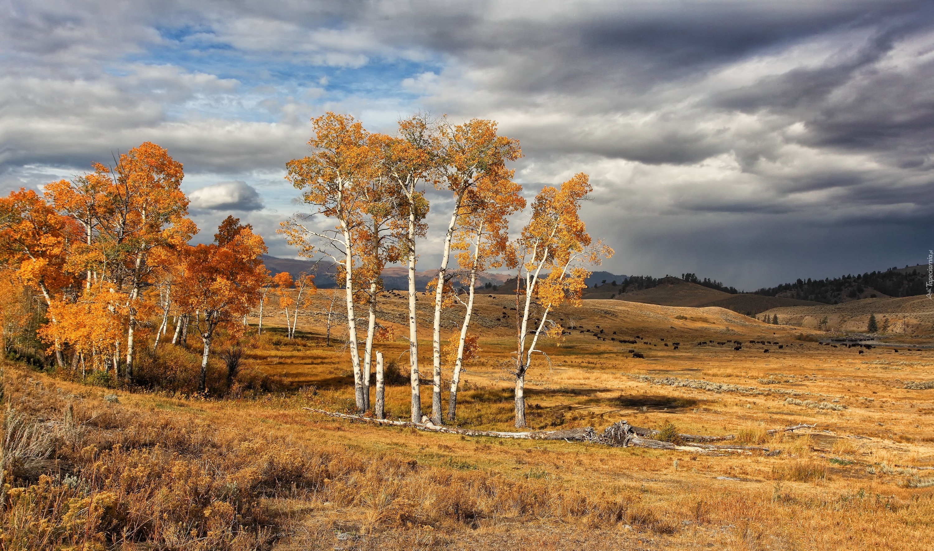 Edytor tapety: Niebo, Brzozy, Pola, Jesień
