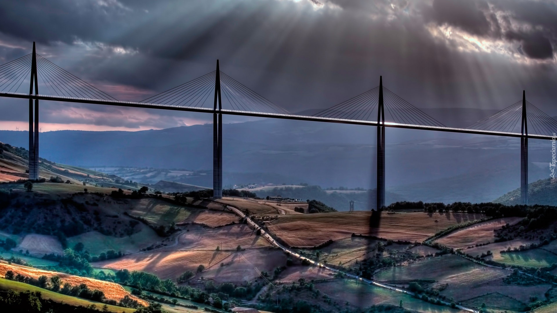 Edytor tapety: Francja, Millau-Millau, Le Wiadukt Millau, Dolina, Rzeki, Tarn, Pola uprawne, Wzgórza, Promienie, Słońca