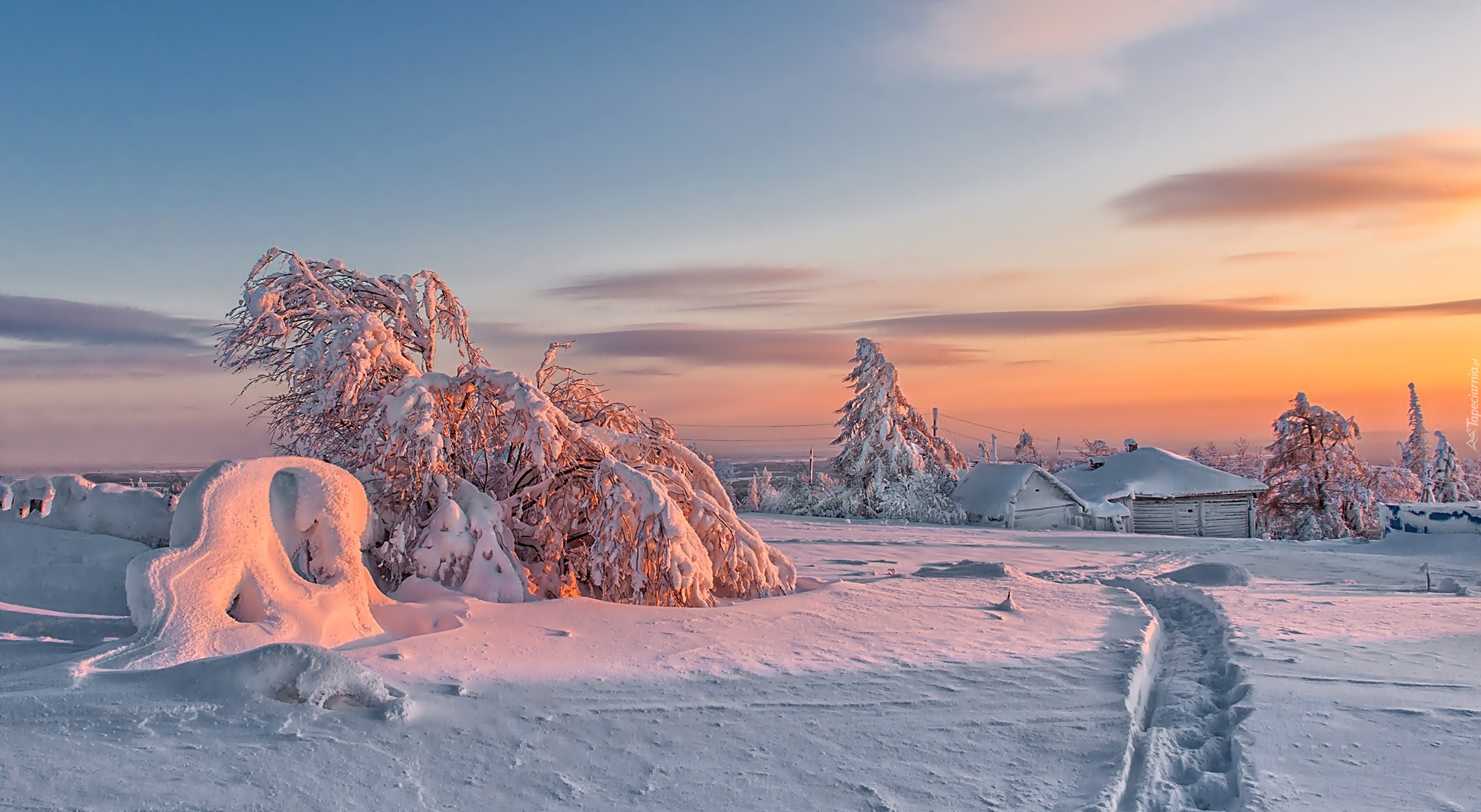Edytor tapety: Ośnieżone, Drzewa, Domy, Ścieżka, Wieś