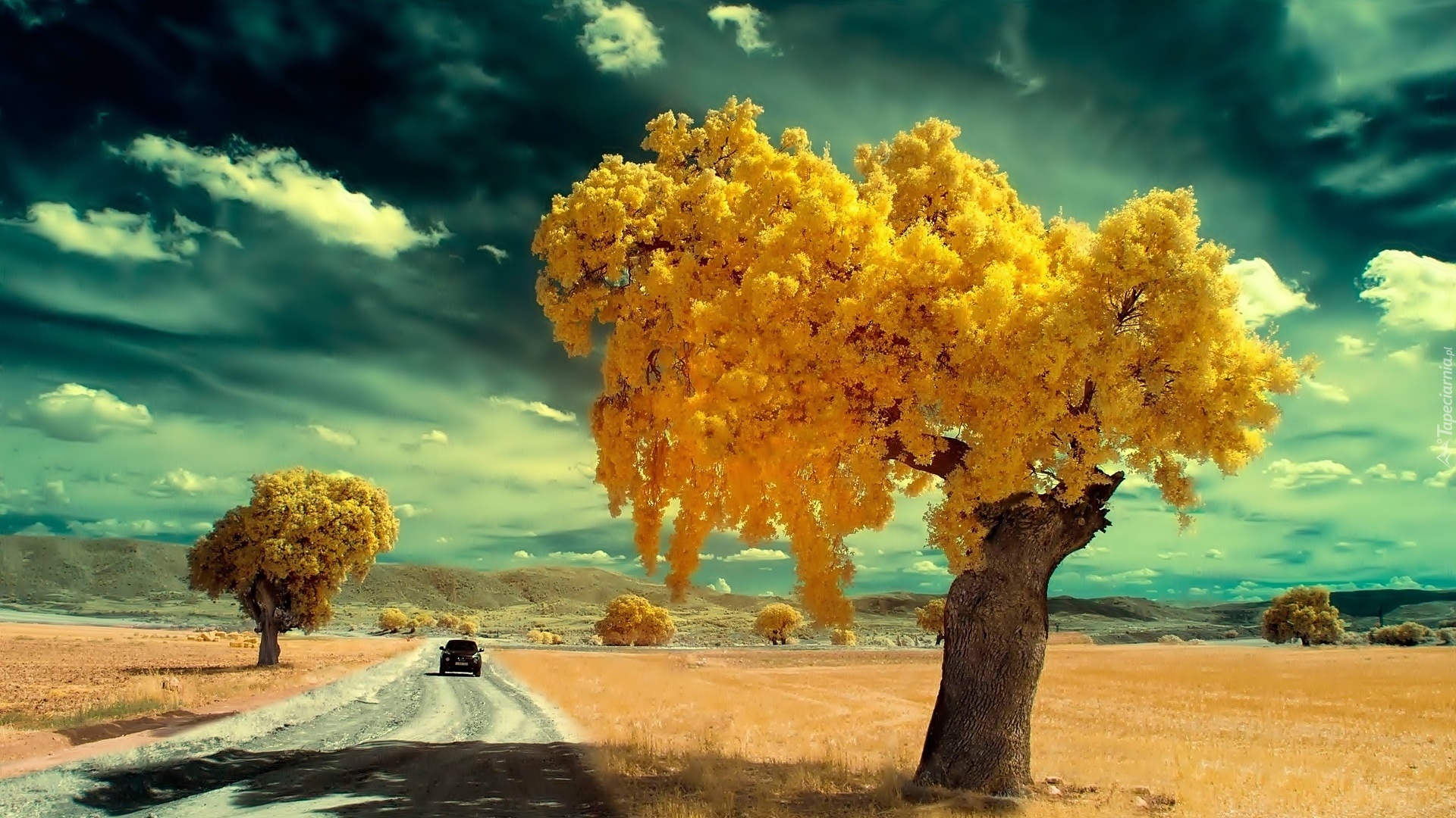Edytor tapety: Żółte, Kwitnące, Drzewa, Droga, Pola, Czarne, Chmury